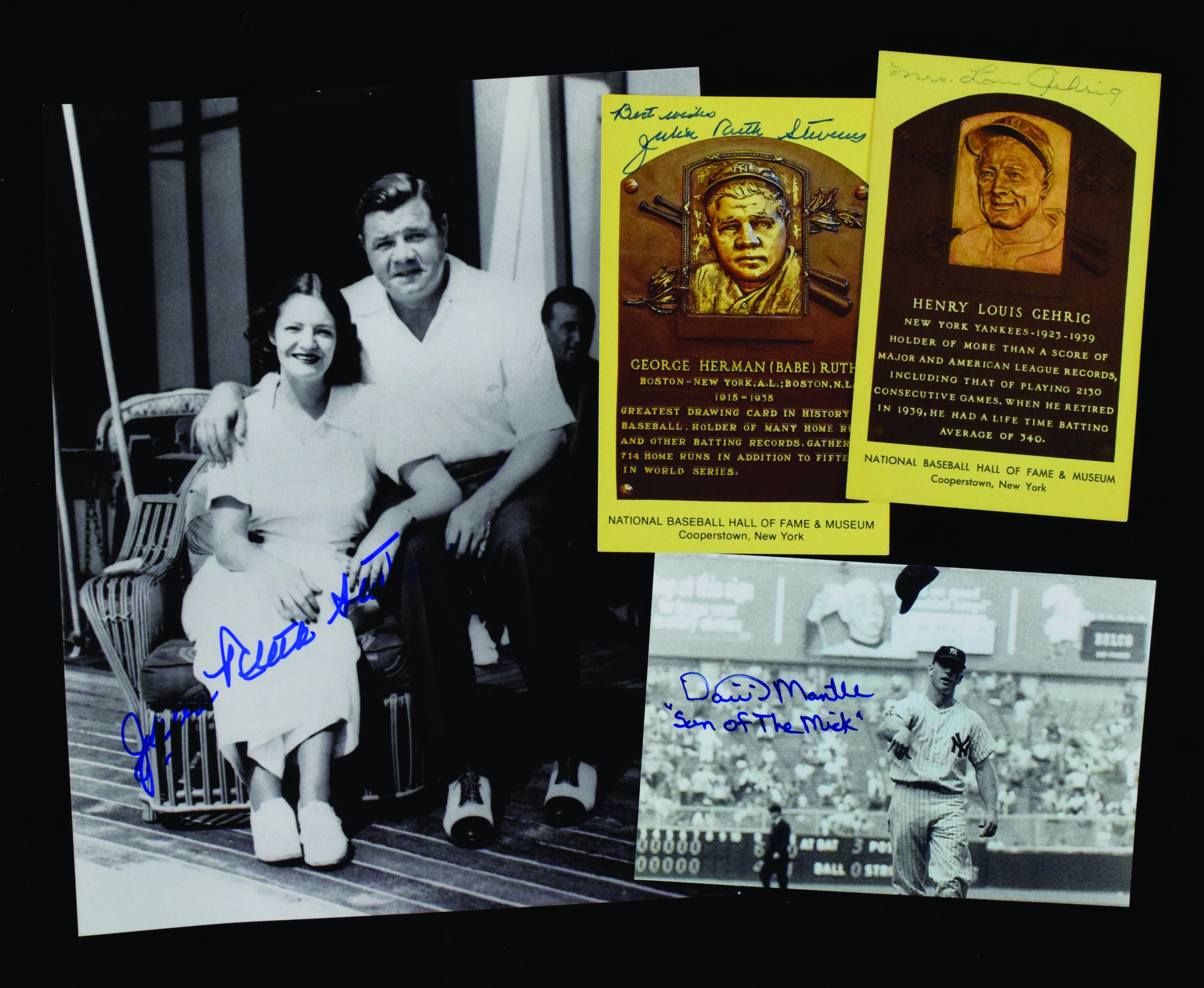 Description:Relatives of baseball HOFers autograph lot with Gehrig, Mantle, Robinson, Ruth (VG/EX-NM). Includes a Lou Gehrig HOF plaque postcard signed by Mrs. Lou Gehrig, Babe Ruth HOF plaque postcard signed by Julia Ruth Stevens, 8"x10" photo signed by Julia Ruth Stevens, 4"x6" Mickey Mantle photo signed by David Mantle with "Son of The Mick" inscription. Signatures rate 7 (Gehrig) to 10 (avg 8) out of 10: VG/EX-NM.