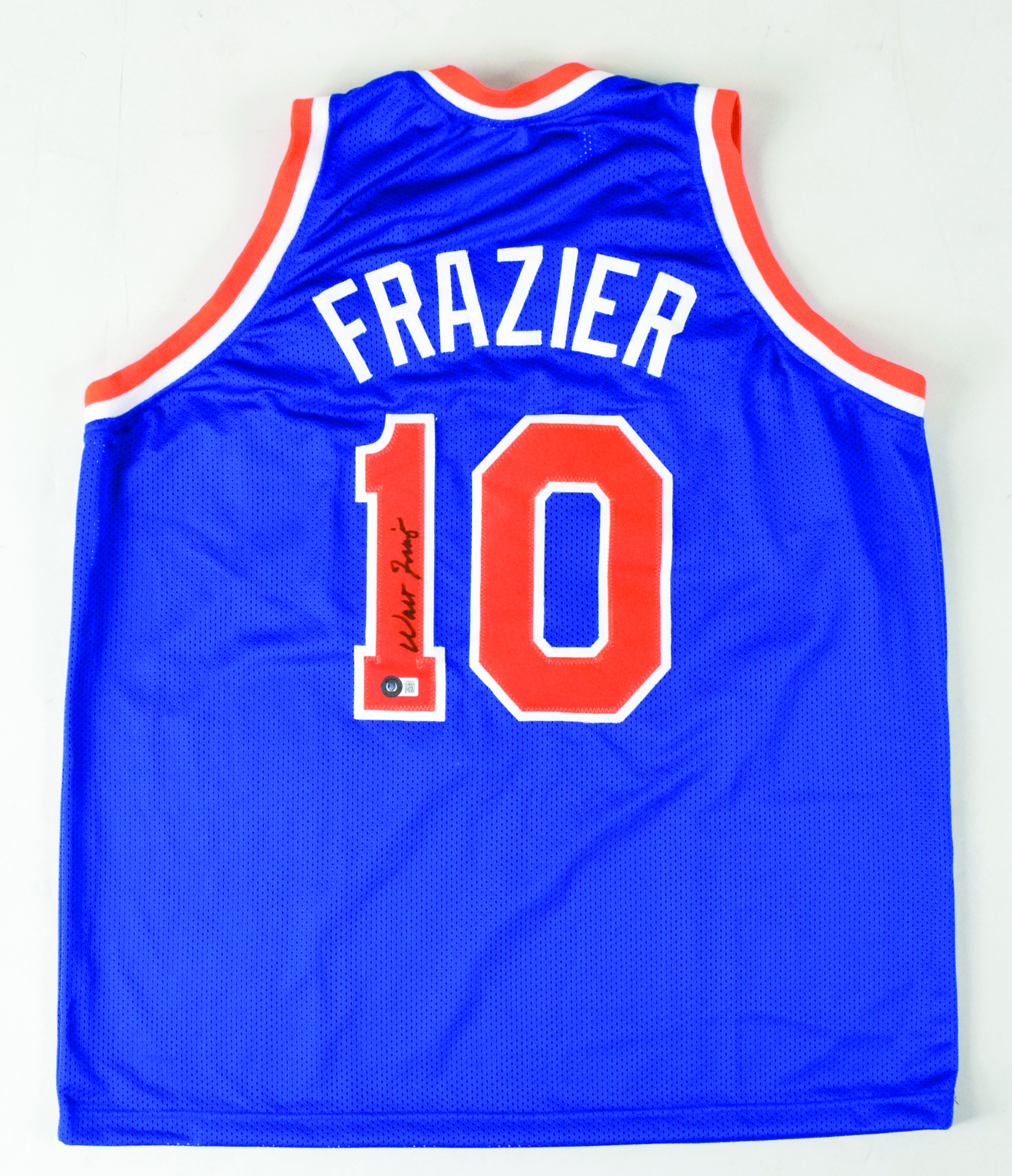 Description:Walt Frazier autographed N.Y. Knicks replica jersey with Beckett authentication (Sig. MT). Size XL generic N.Y. Knicks Walt Frazier jersey has been signed on the back number by Frazier, rating 9 out of 10. A Beckett Witnessed authentication sticker is also affixed to the jersey, which has no mentionable wear: NM/MT.