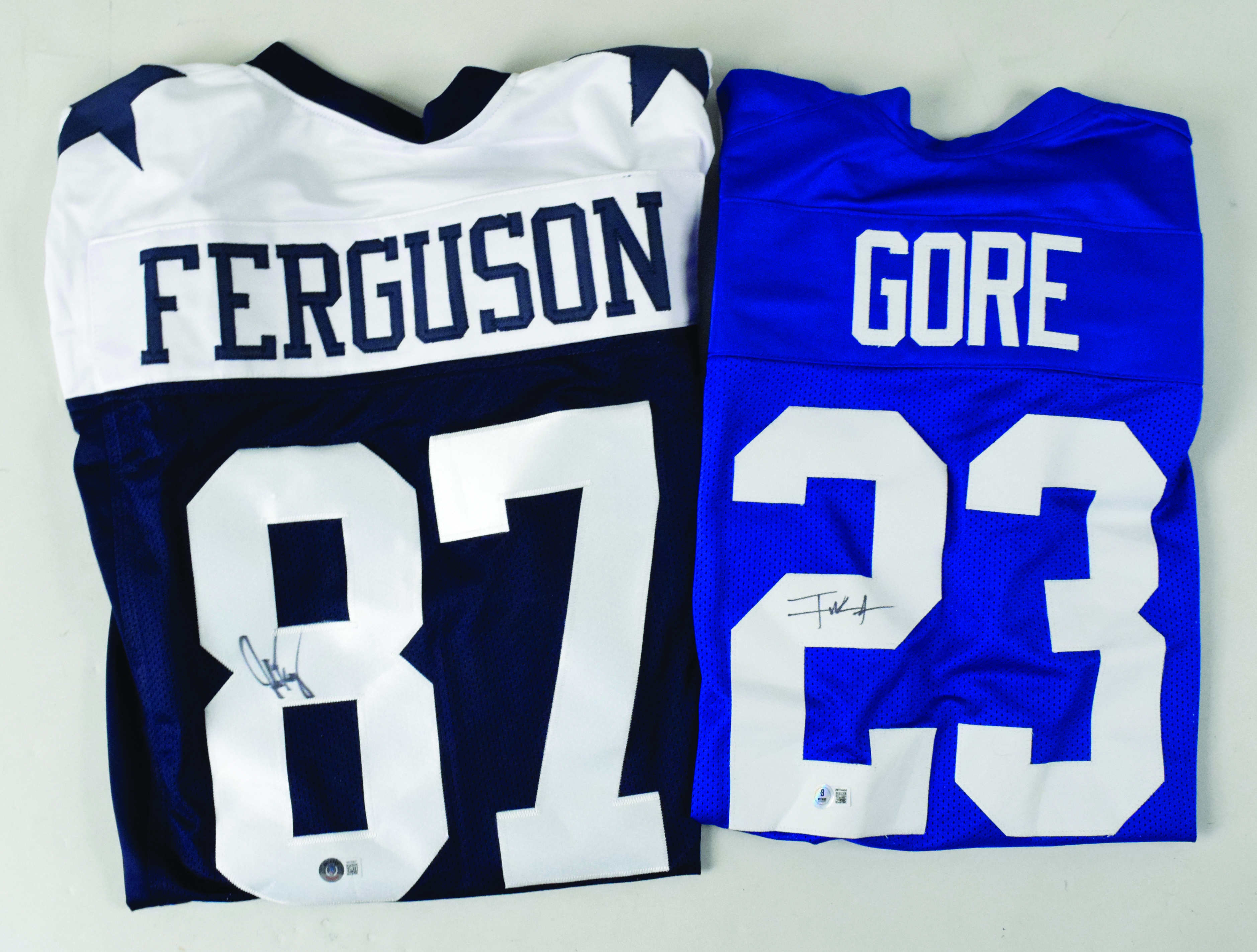 Description:Lot of (2) autographed FB replica jerseys, with Jake Ferguson & Frank Gore & Beckett auth (Sigs. NM/MT). Both are size XL generic jerseys, with (1) Dallas Cowboys Jake Ferguson jersey, signed on the back number by Ferguson; and (1) Indianapolis Colts Frank Gore jersey, signed on the back number by Gore. Signatures rate 8 out of 10, and Beckett Witnessed authentication stickers are affixed to both jerseys. Jerseys have no mentionable wear: NM/MT.