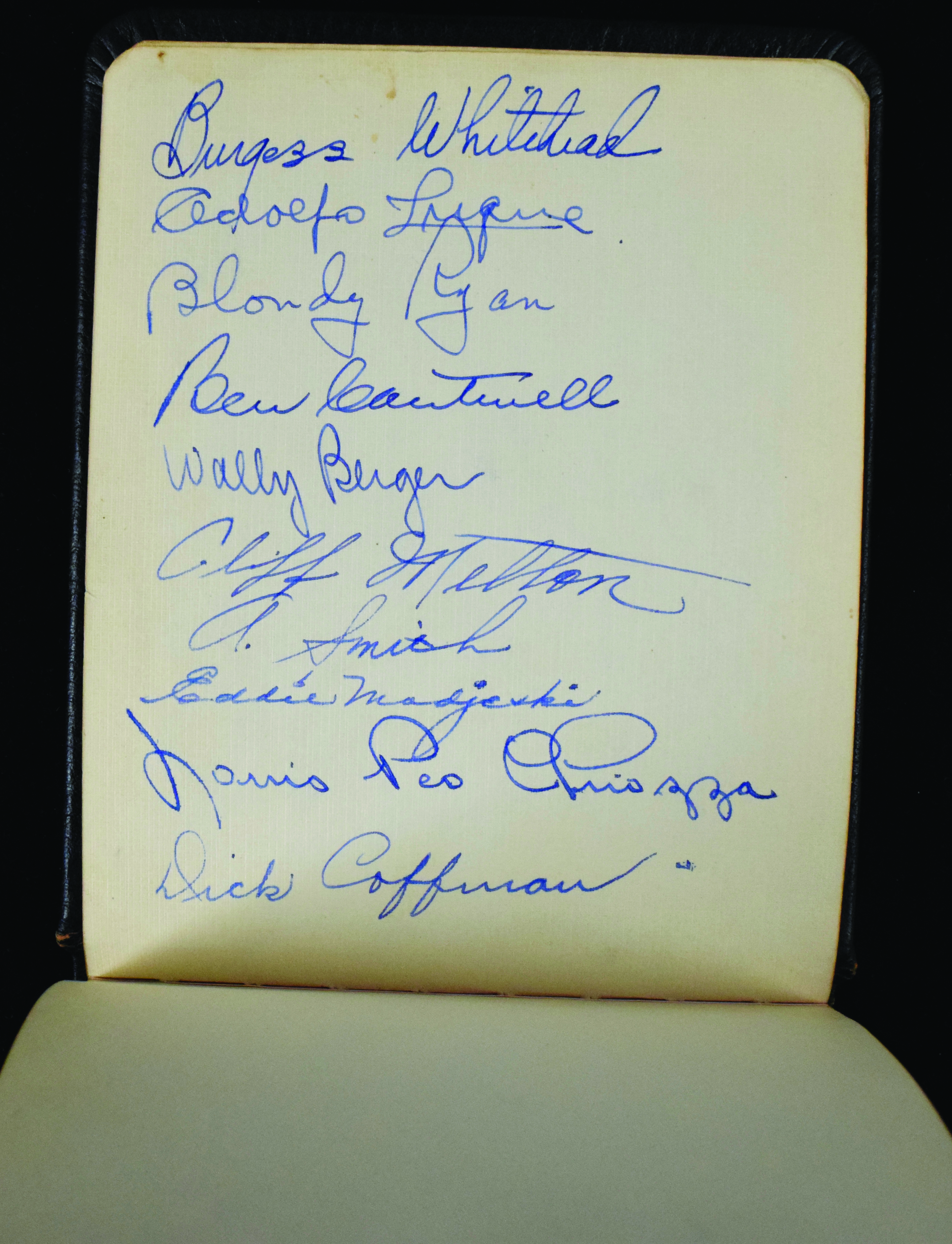 Description:Early 1930s autograph album with baseball and entertainers (Claire Ruth, Adolfo Luque) (EX-NM) Standard size faux leather bound autograph album including some multi-signed baseball related pages and single signed (mostly entertainer) pages. Includes page signed on both front and back by (18) New York Giants including Alofo Luque, Carl Hubbell, Dick Bartell, Hal Schumacher, Jimmie Ripple, Wally Berger, and others; multi-signed page by Sam West, Carl Reynolds, Bump Hadley, Eddie Wells; multi-signed page (dated 1998) with Red Schoendienst, Roy Sievers, and Mike Shannon; entertainer/other signed pages including Rudy Vallee, Victor Moore, George Raft, Jack Hayley (2, one a signed slip of paper affixed to page), Claire Ruth (wife of Babe - 2, one a signed slip of paper affixed to page), Libby Holman, Fred Allen, Mrs. Fred Allen, Clifton Webb, Herbert Berger (2, 1 with Rose Deister), Leo Carrillo, Ted Shaprio, Joe E. Brown (cut affixed to page), Yankees player Jimmie Reese (slip of paper affixed to page, dated 1931), Buddy Rogers, and some others. Signatures rate 6 to 9 out of 10. Light handling and storage wear. There are several pages which were removed: EX-NM