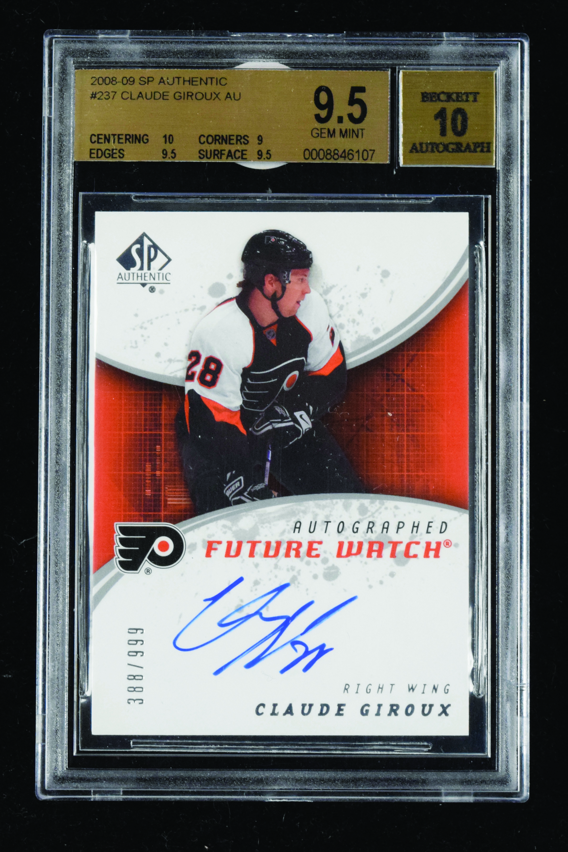 Description:2008-09 SP Authentic #237 Claude Giroux signed rookie card #ed 388/999 graded Beckett 9.5 (Gem MT, auto graded 10).