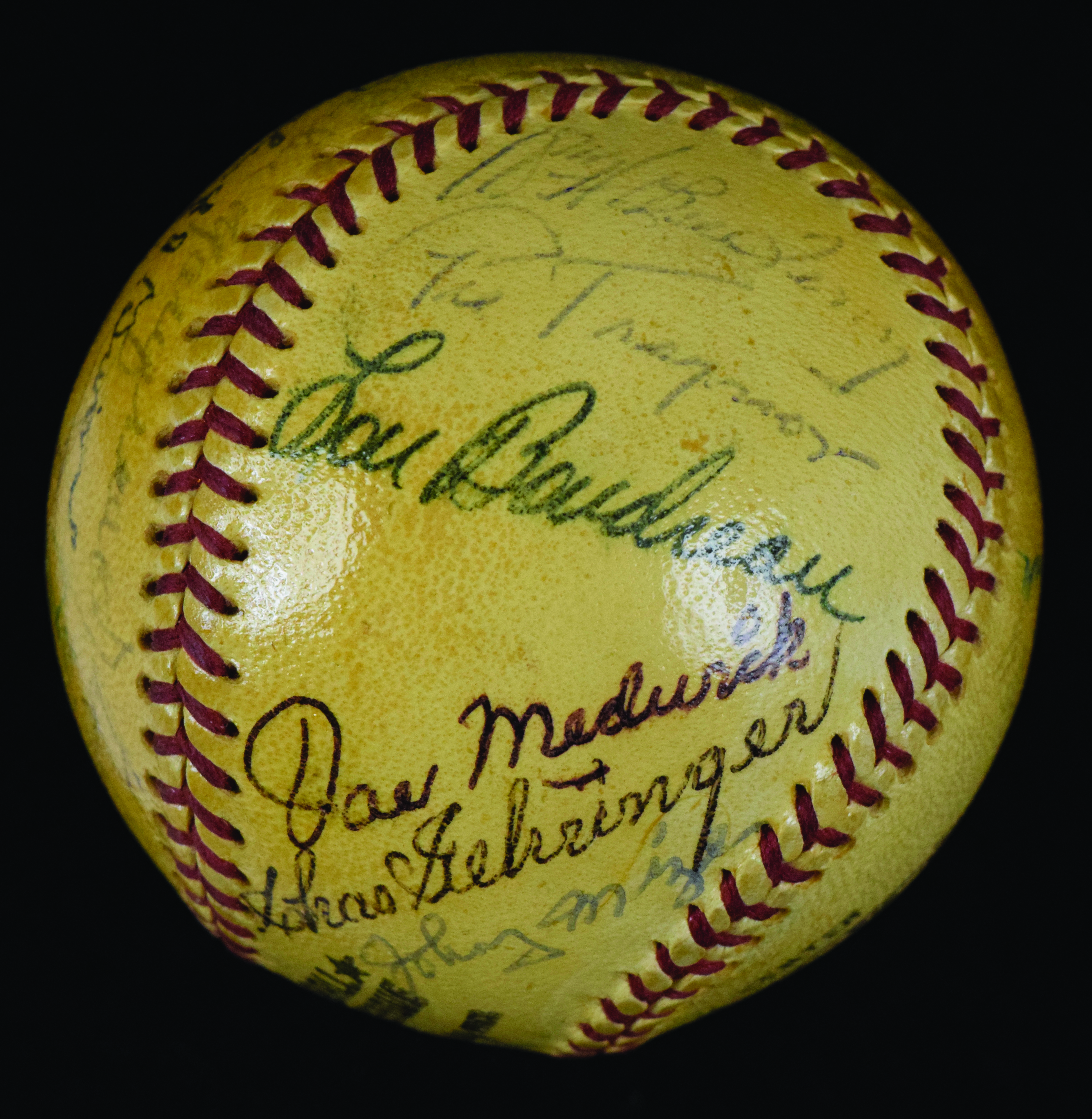 Description:Hall Of Famers multi-signed baseball with (23) autographs including tougher names (VG/EX). C.Feeney NL ball signed by Stan Musial, Sam Rice, Bill Terry, Pie Traynor, Lou Boudreau, Joe Medwick, Charlie Gehringer, Johnny Mize, Max Carey, Lloyd Waner, Earle Combs, Zack Wheat (very faded), Edd Roush, Harry Hooper, Stan Coveleski, Bob Feller, Yogi Berra, Joe Cronin, Rube Marquard, Burleigh Grimes, Bill Dickey, Lefty Grove, and Ford Frick. Signatures rate 1/2 (Wheat) to 9 (avg 7) out of 10. Lighted shellacked, and toning on each panel: VG/EX ($400-$600)