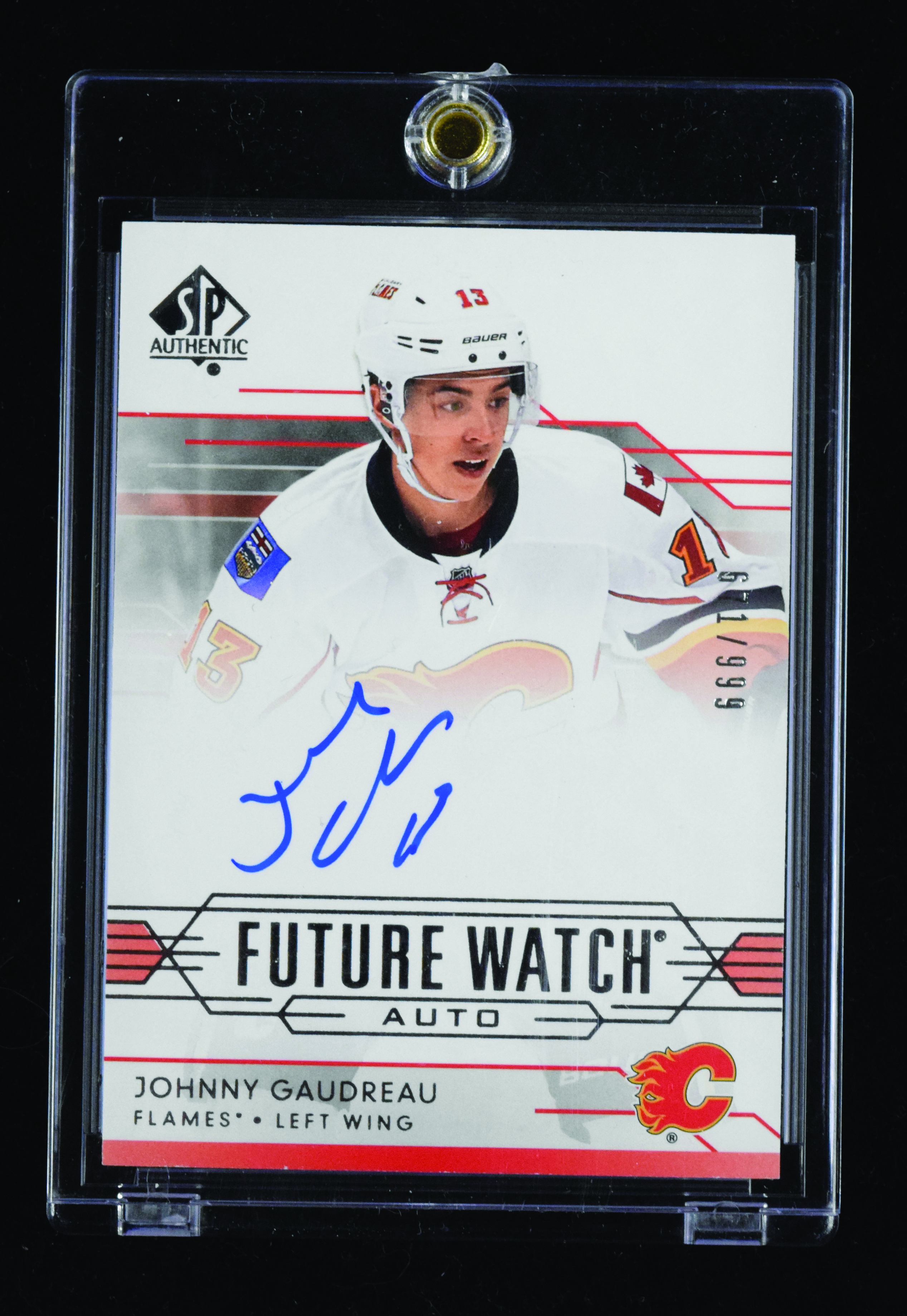 Description:Johnny Gaudreau signed 2014-15 SP Authentic serial numbered rookie card (NM/MT). 2014-15 SP Authentic #306 signed by Gaudreau in blue marker. Signature rates 9/10 out of 10. The card is #ed 671/999: NM/MT