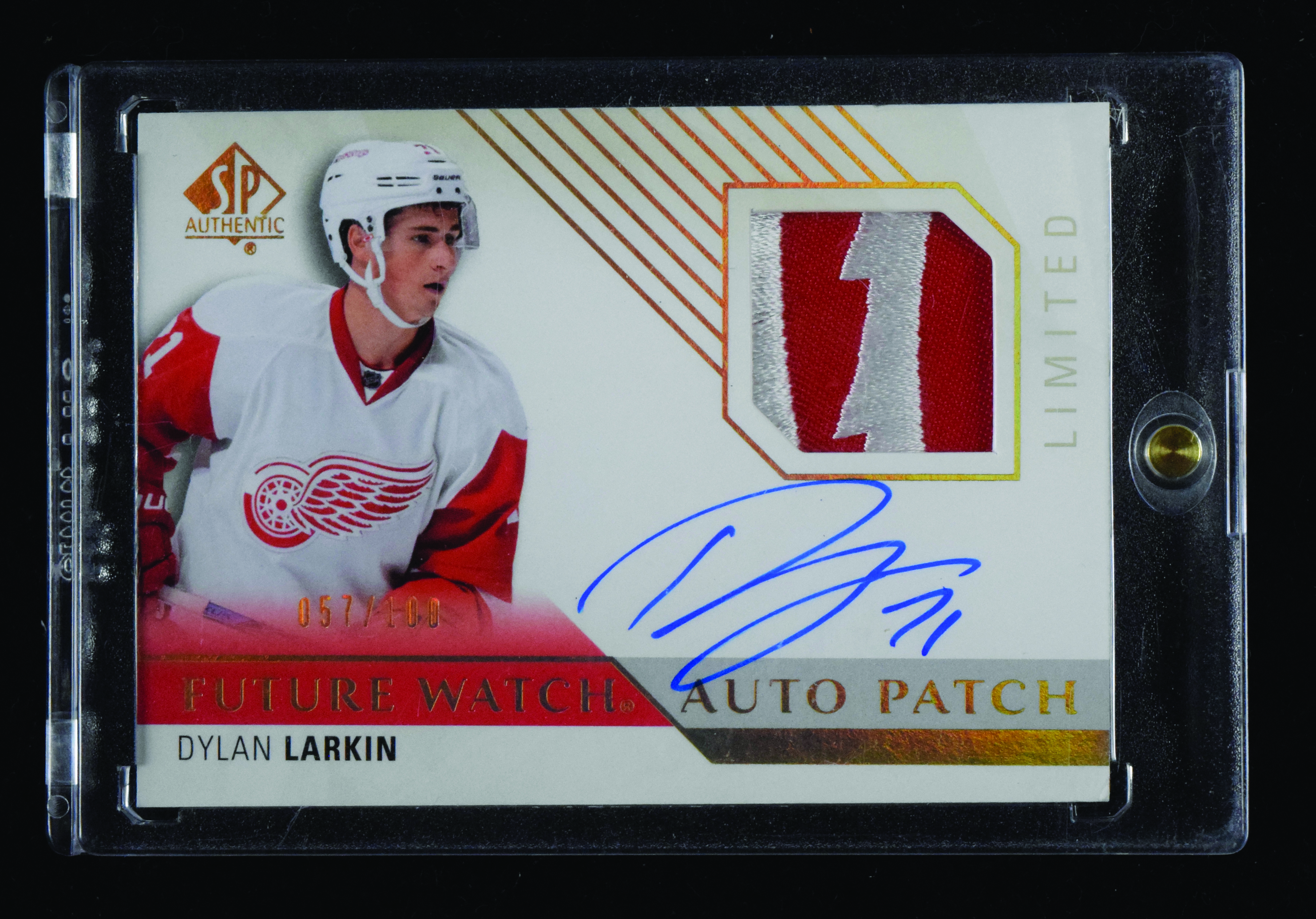 Description:Dylan Larkin signed 2015-16 SP Authentic serial #ed rookie patch autograph card (NM/MT). 2015-16 SP Authentic "Limited Auto Patches" #260 signed by Larkin in blue marker. Signature rates 9/10 out of 10. The card is numbered 57/100: NM/MT