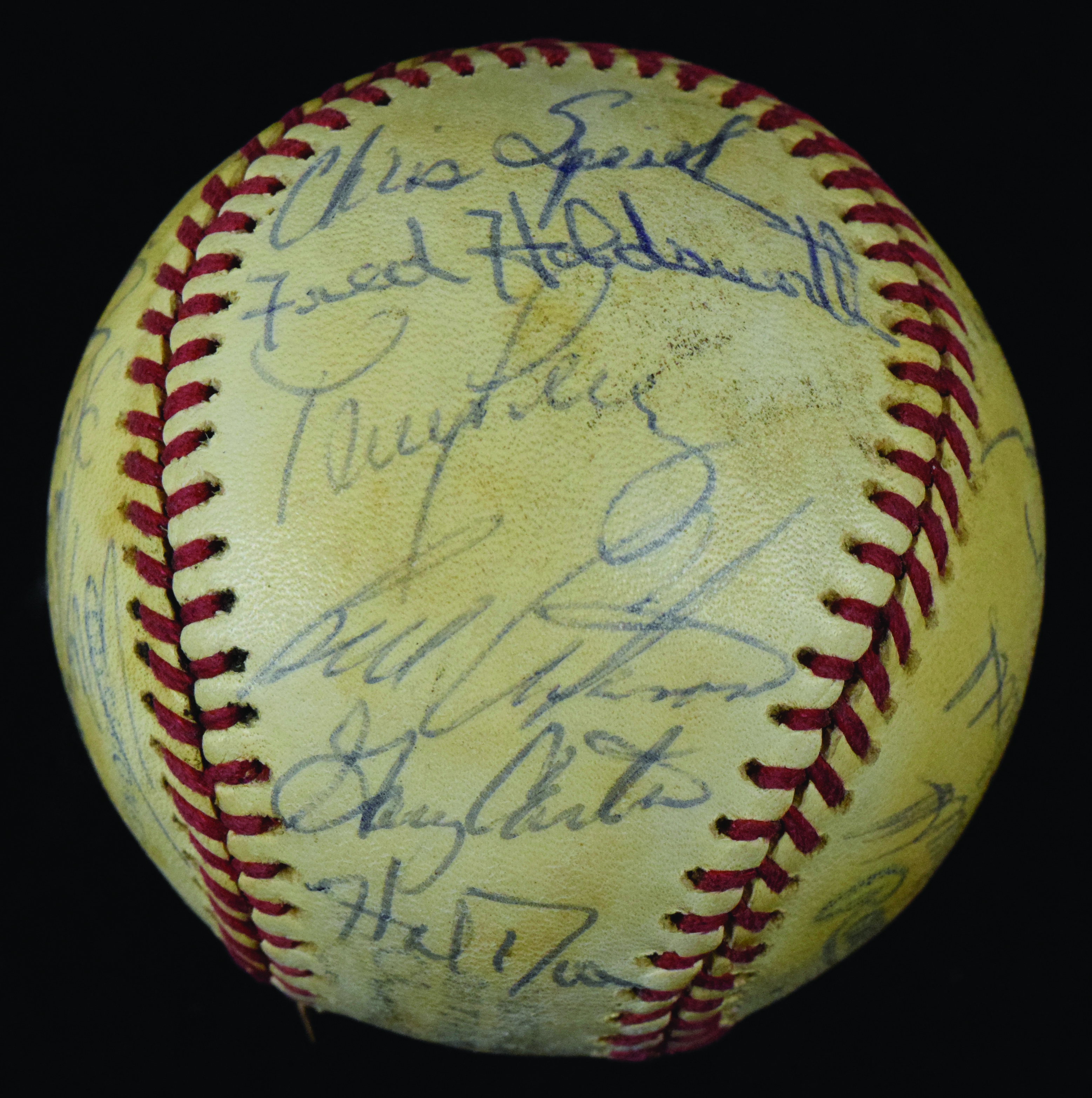 Description:1978 Montreal Expos team signed baseball (VG/EX). C.Feeney NL ball signed by (26) members of the 1978 Expos including Dick Williams, Gary Carter, Andre Dawson, Tony Perez, Ellis Valentine, Steve Rogers, Warren Cromartie, Chris Speier, Larry Parrish, Hal Dues, Ross Grimsley, Dave Cash, Del Unser, and others. Signatures rate 7 to 8/9 out of 10. Areas of toning on each panel: VG/EX