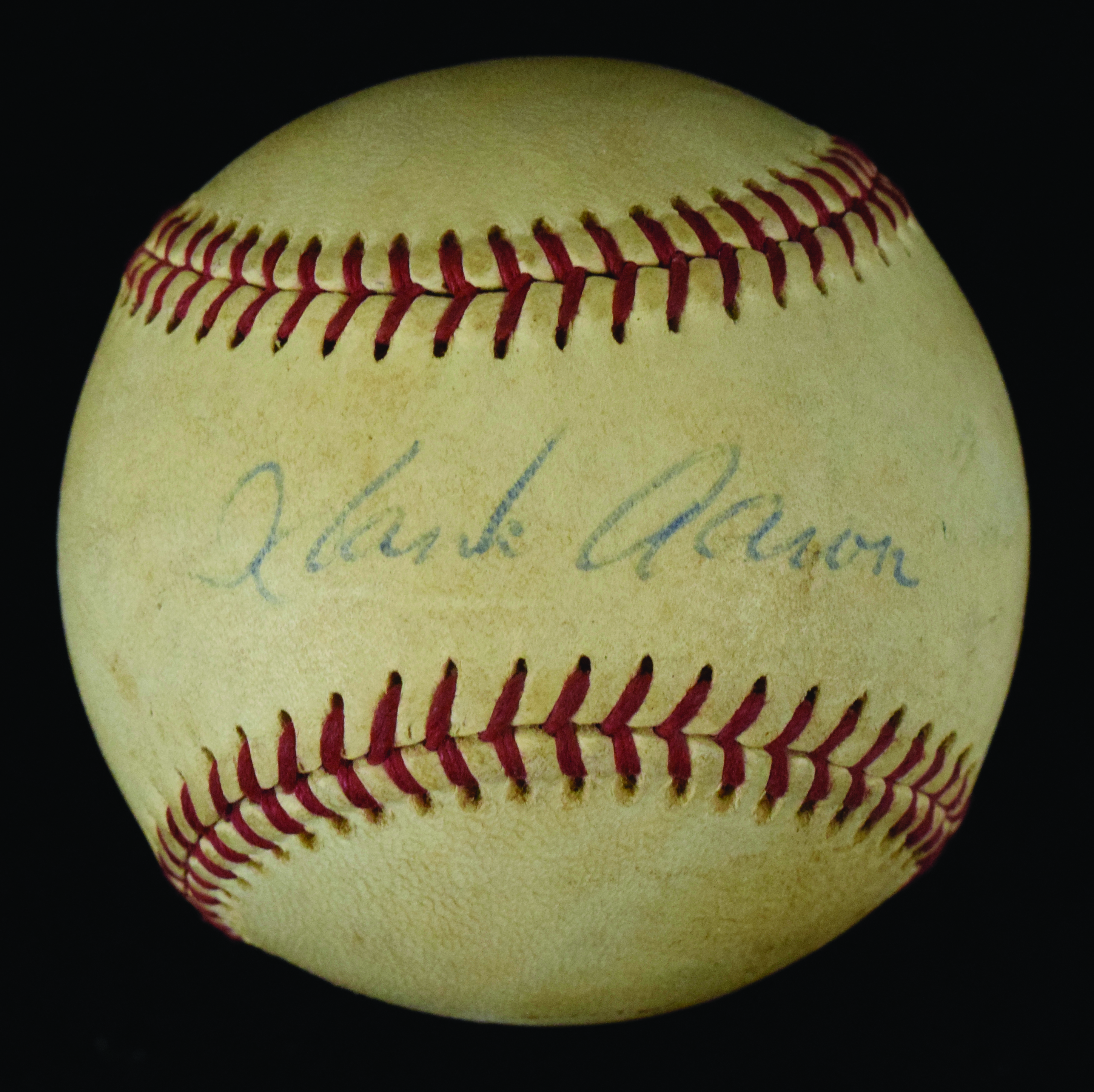 Description:Hank Aaron playing career era signed baseball, c.early-mid 1970s (VG/EX). C.Feeney NL ball signed across the sweet spot by Hank Aaron in blue ink. Signature rates 8 out of 10. Scattered surface wear associated with use: VG/EX