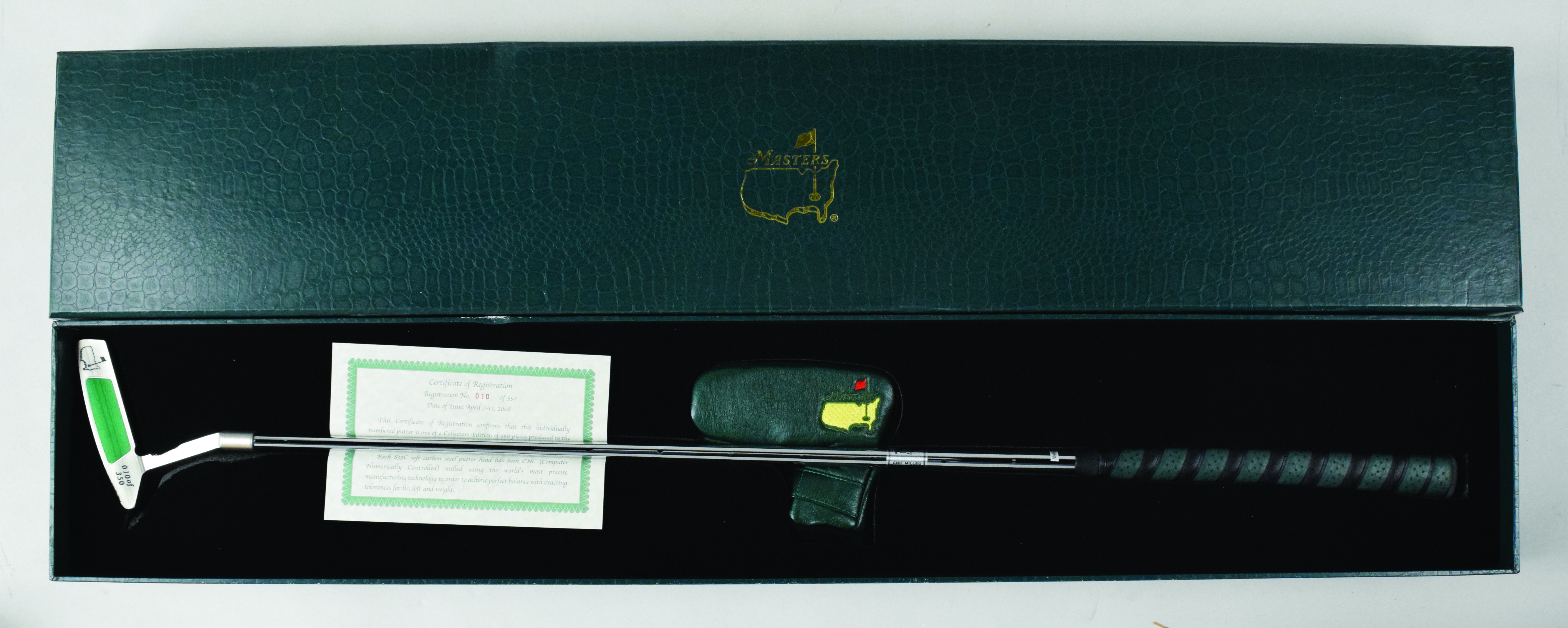 Description:Limited edition Masters putter (NM/MT). Collectors edition produced exclusively for the 2008 Masters Tournament. Numbered 10/350. Includes certificate of registration, and leather head cover: NM/MT