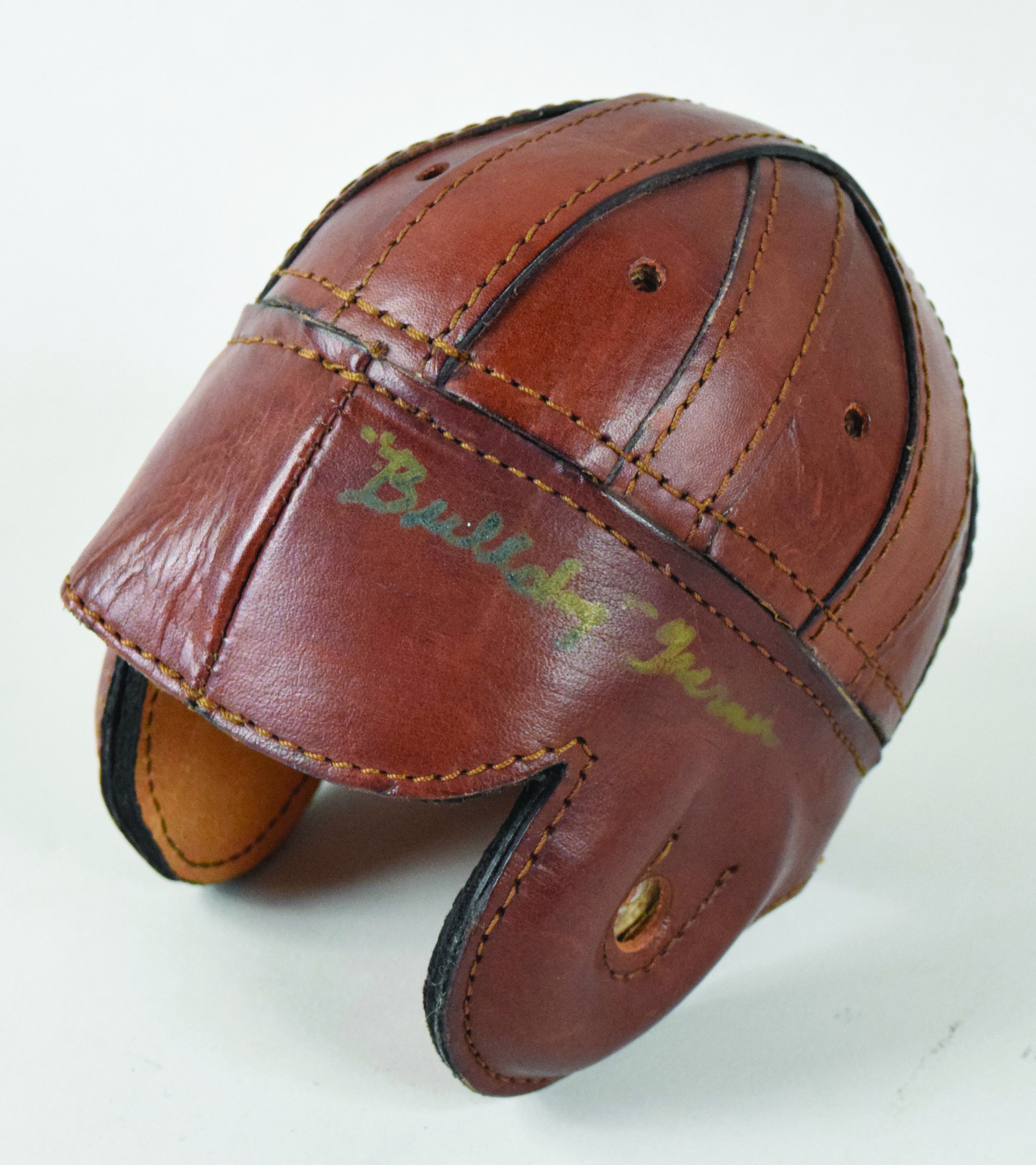 Description:Bulldog Turner signed leather throwback mini helmet (NM). Turner signed the helmet in gold marker. Signature rates 7 out of 10 (ink reaction with leather): NM