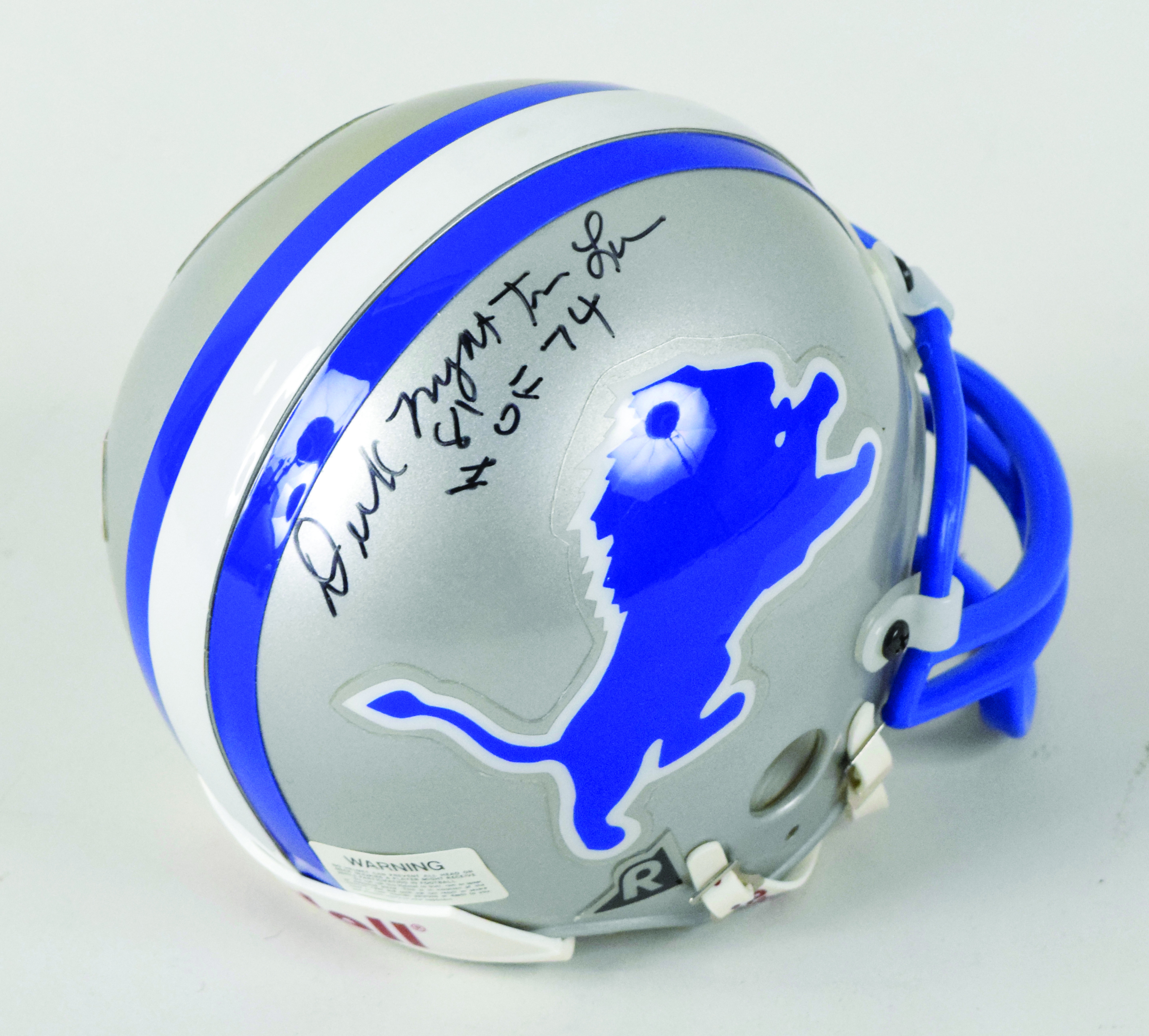 Description:Dick "Night Train" Lane signed and inscribed Detroit Lions mini helmet (NM). Lane signed the helmet in black marker and added "HOF 74" inscription. Signature rates 8/9 out of 10: NM