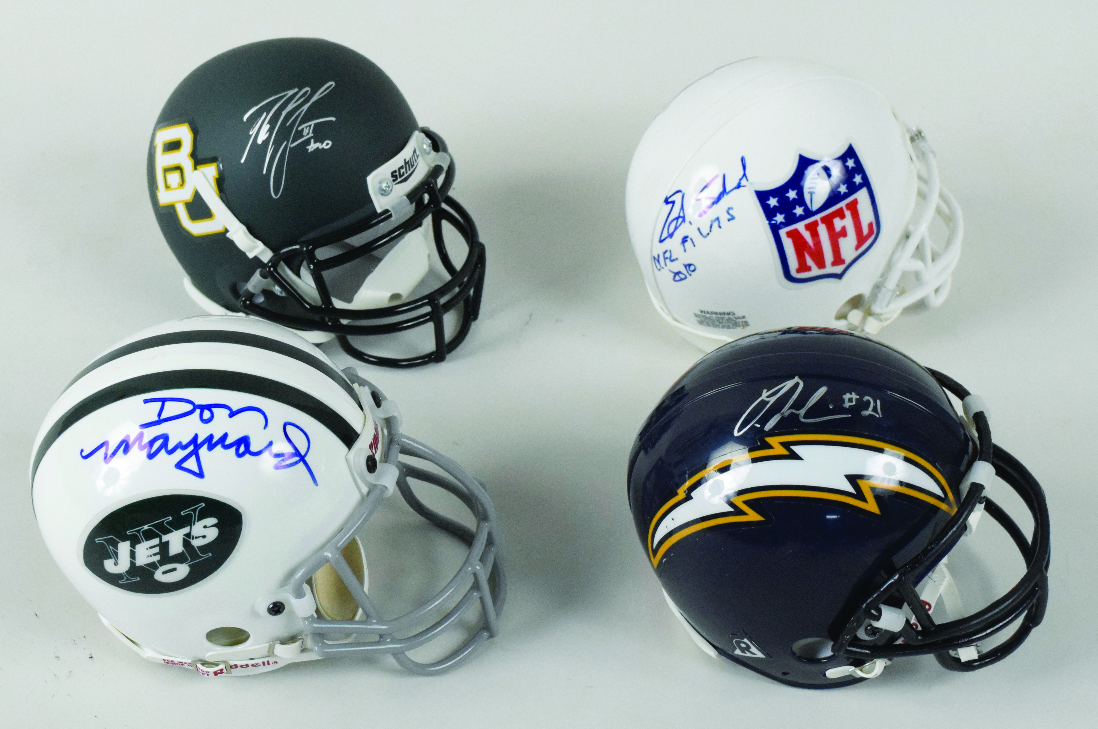 Description:Don Maynard, LaDainian Tomlinson, Ed Sabol, Robert Griffin III signed mini helmets (NM-NM/MT). Includes a New York Jets mini helmet signed by Don Maynard, San Diego Chargers mini helmet signed by LaDainian Tomlinson (Tri-Star), NFL logo mini helmet signed by Ed Sabol with "NFL Films 2010" inscription (PSA/DNA), and Baylor Bears mini helmet signed by Robert Griffin III (JSA). Signatures rate 8 to 9/10 out of 10: NM-NM/MT