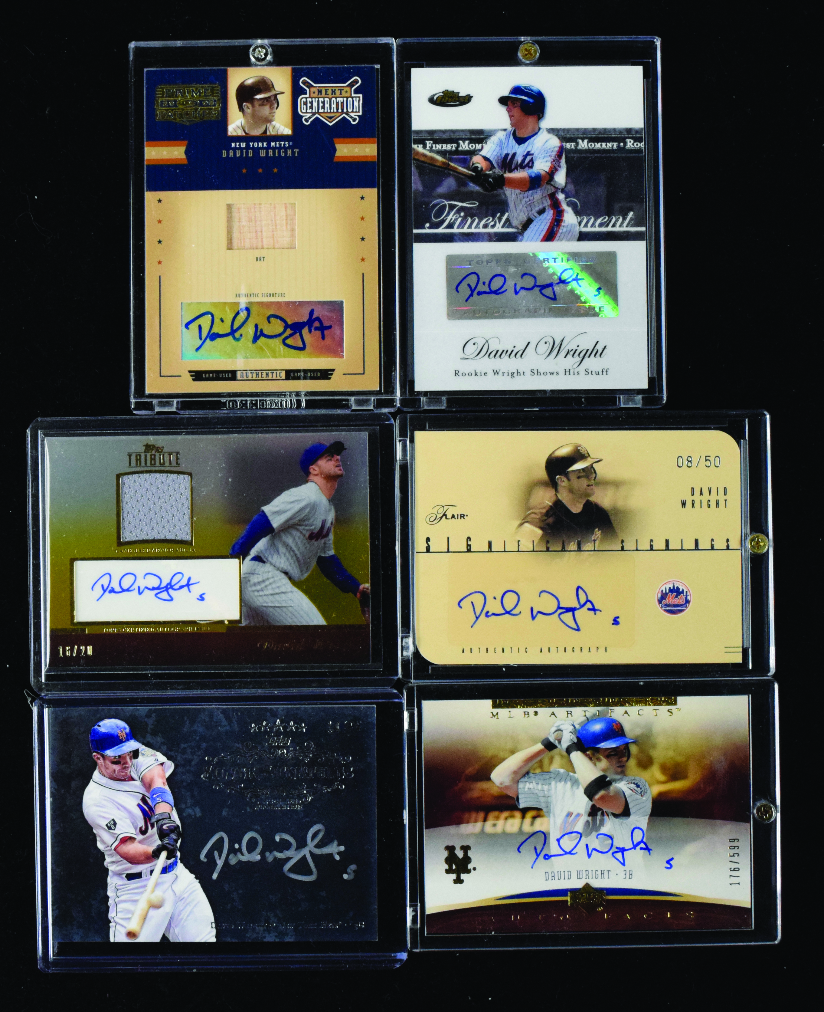 Description:Lot of (8) David Wright signed insert cards including serial numbered & relics (NM-NM/MT). Includes 2005 Donruss Prime Patches "Next Generation Autograph Bat" #NG-6 signed by Wright (#ed 41/150), 2005 Fleer Flair "Significant Signings Die Cut Silver" #DD-DW signed by Wright (#ed 8/50), 2005 Upper Deck Artifacts "Auto Facts" #DW signed by Wright (#ed 176/599), 2007 Topps "Highlights Autographs" #HA-DW signed by Wright, 2007 Topps Finest "Rookie Finest Moments Autographs" #RFMA-DW signed by Wright, 2008 Topps Allen & Ginter "Framed Mini Autographs" #AGA-DW signed by Wright, 2011 Topps Tribute "Autograph Relics Gold" #TAR-DW1 signed by Wright (#ed 16/20), and 2013 Topps Five Star "Silver Signatures" #FSSS-DW signed by Wright (#ed 10/65). Signatures rate 8/9 to 10 out of 10: NM-NM/MT