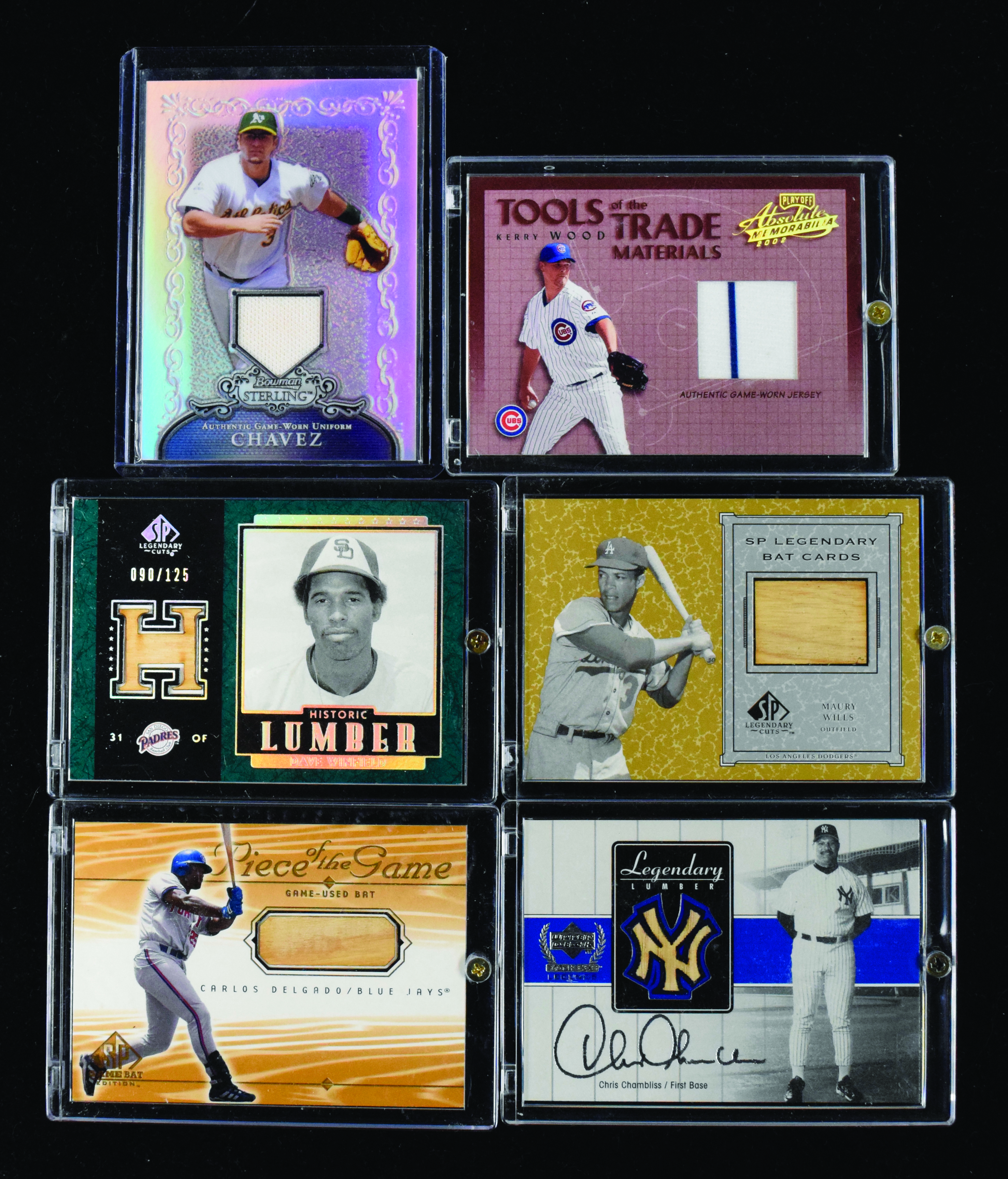 Description:Lot of (59) baseball game used relic swatch insert cards (NM-NM/MT overall). Includes (16) Dave Winfield, (2) Maury Wills, Joe Collins, (3) Carlos Delgado, Chris Chambliss, (11) Eric Chavez, (3) Kerry Wood, Marty Cordova, (2) Chad Cordero, (3) Tony Clark, Jeff Cirillo, (4) Luis Castillo, Vinny Castilla, (2) Joe Crede, (3) Jack Cust, Roger Cedeno, Jesse Crain, Jeff Clement, dual-relics card of Mark Prior / Kerry Wood, and dual-relics card of Matt Morris / Kerry Wood: NM-NM/MT overall