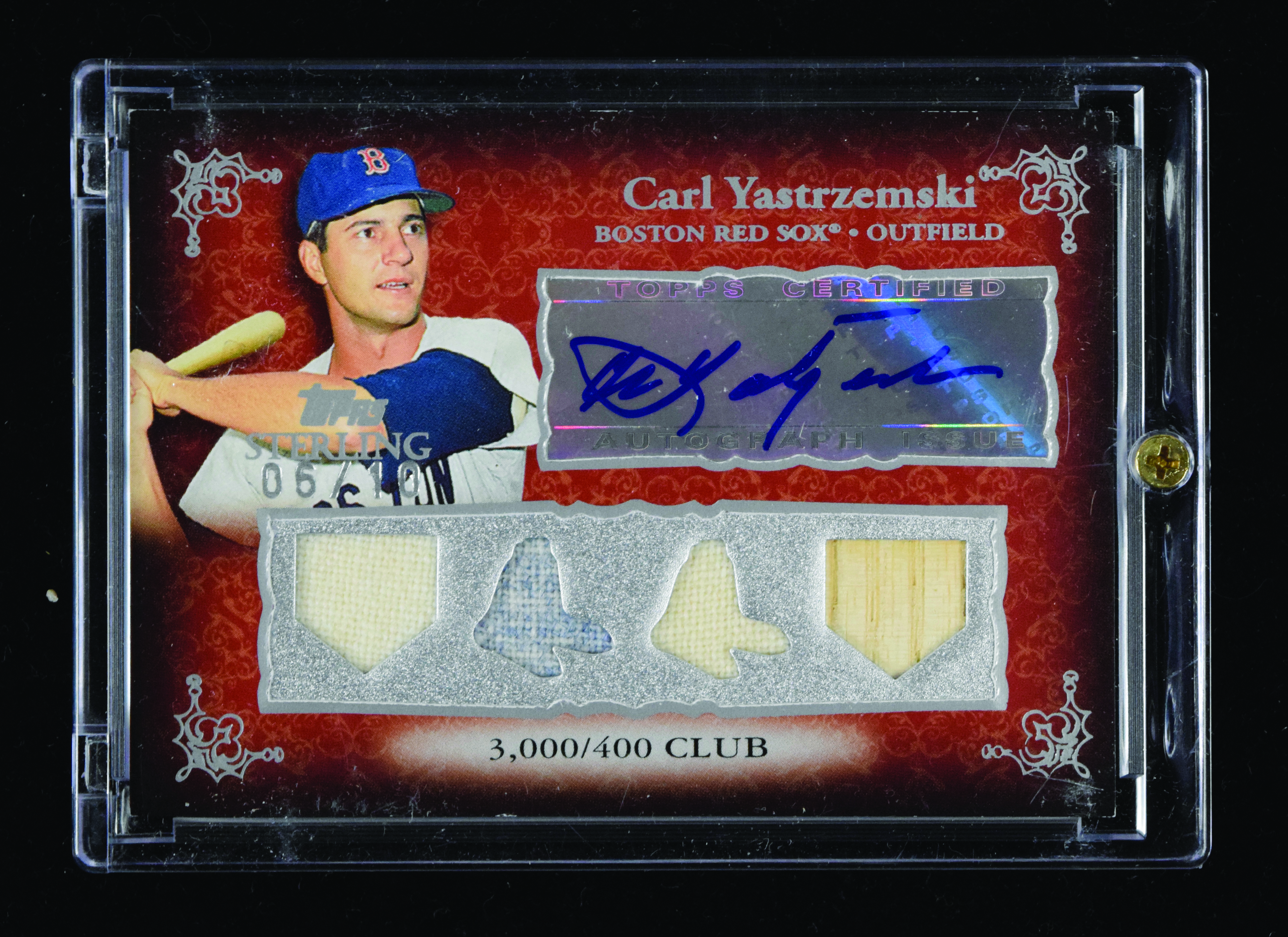 Description:Carl Yastrzemski signed 2007 Topps Sterling quad relics insert card #ed 6/10 (EX/MT). 2007 Topps Sterling "Moments Relics Autographs Quad" #4SMA-7 signed by Yastrzemski in blue marker. Signature rates 9/10 out of 10. The card is numbered 6/10. Minor corner/edge wear: EX/MT