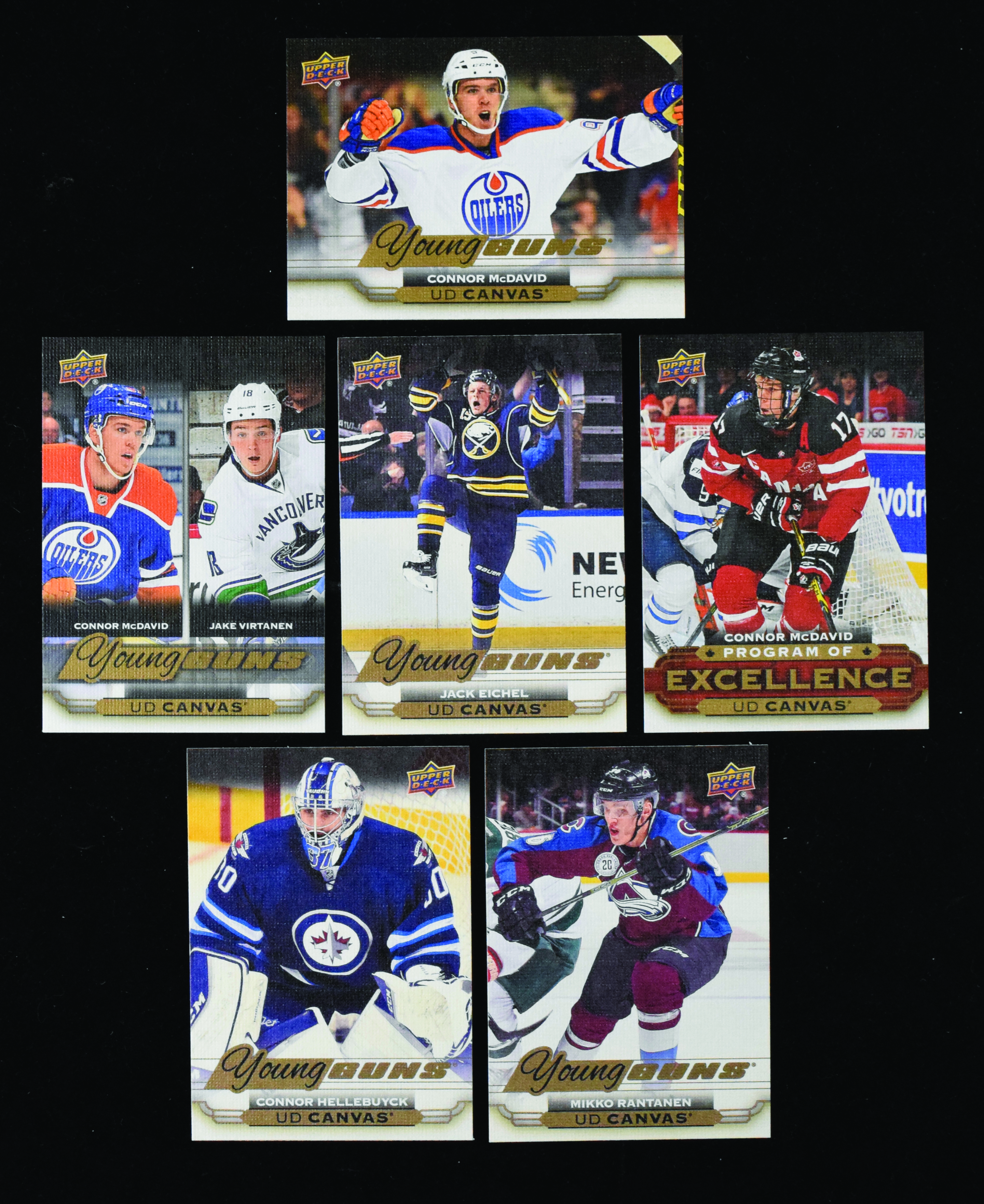 Description:2015-16 Upper Deck Canvas complete set (273) with Connor McDavid Young Guns RC (MT overall). Highly desirable, high-grade complete set is housed in pages and a binder in team order with all of the short-printed Young Guns rookies, including #s C211 Connor McDavid, C270 McDavid Program of Excellence, C240 McDavid YG Checklist, C91 Jack Eichel and many others. Most cards appear MT or better. ($1,000-$1,500)