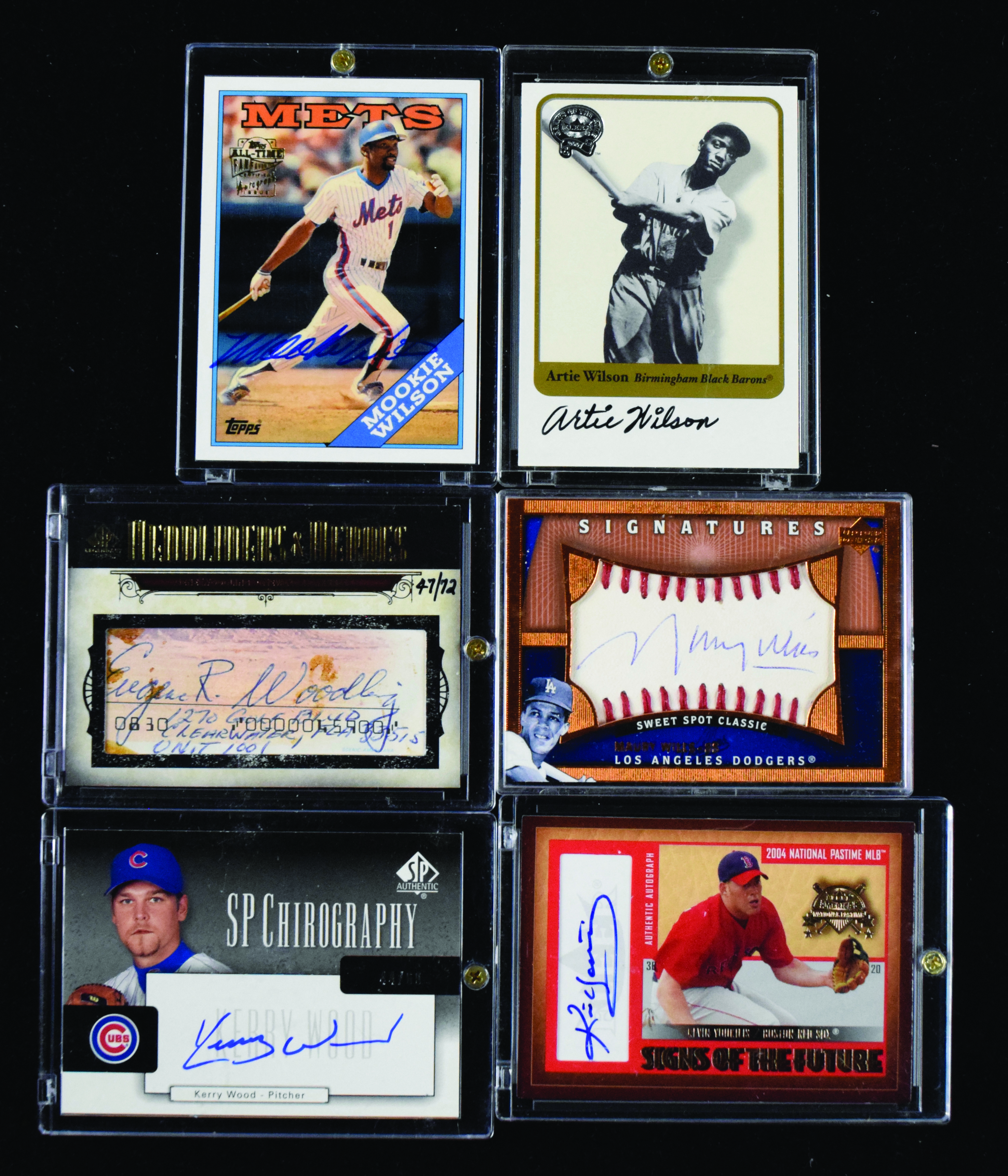 Description:Lot of (50) signed baseball rookie and insert cards (NM-NM/MT overall). Includes Maury Wills, Gene Woodling, Artie Wilson, (4) Kerry Wood, Mookie Wilson, (5) Kevin Youkilis, (4) C.J. Wilson, Marty Cordova, (3) Dmitri Young, (3) Francisco Cordero, (12) Kolton Wong, (13) Delmon Young, and Delwyn Young. Signatures rate 7 to 10 (avg 9) out of 10: NM-NM/MT overall