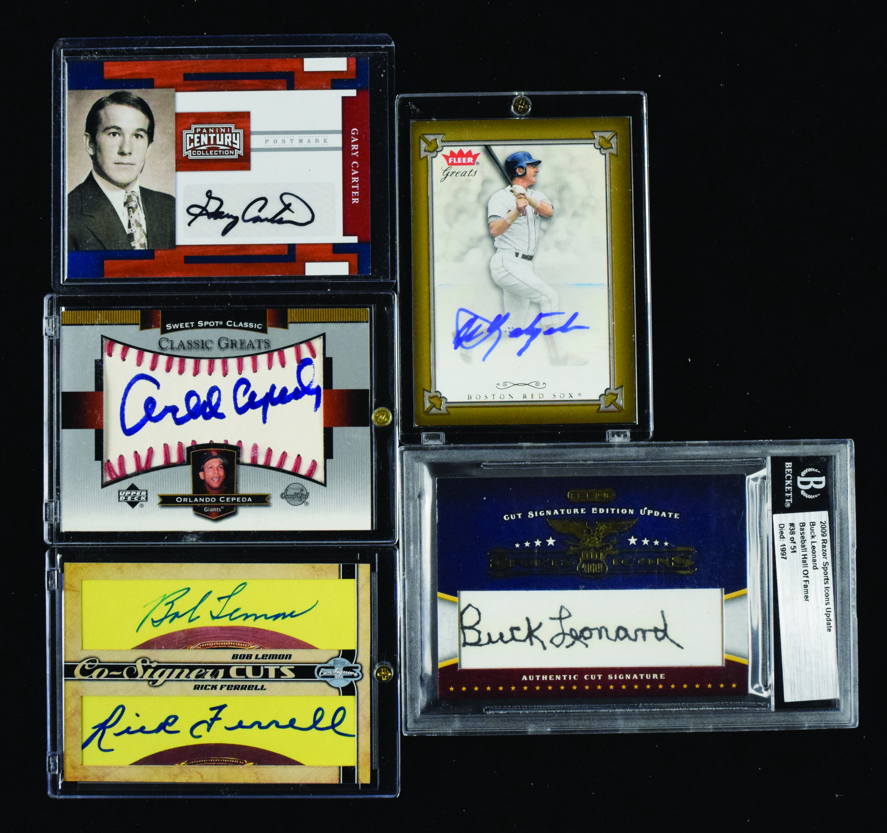 Description:Lot of (5) Baseball HOFers signed insert cards (NM-NM/MT). Includes 2003 Upper Deck Sweet Spot Classic "Autographs Blue Ink" #CG-OC signed by Orlando Cepeda, 2004 Fleer Greats Of The Game "Autographs" #GBA-CY signed by Carl Yastrzemski, 2006 Topps Co-Signers "Dual Cut Signatures" #CUT-BLRF signed by both Rick Ferrell and Bob Lemon, 2009 Razor Cut Signature Edition Update "Sports Icons" signed by Buck Leonard (#ed 38/51), and 2010 Panini Century "Postmarks Silver Signatures" #18 signed by Gary Carter (#ed 8/250). Signatures rate 8 to 10 out of 10: NM-NM/MT