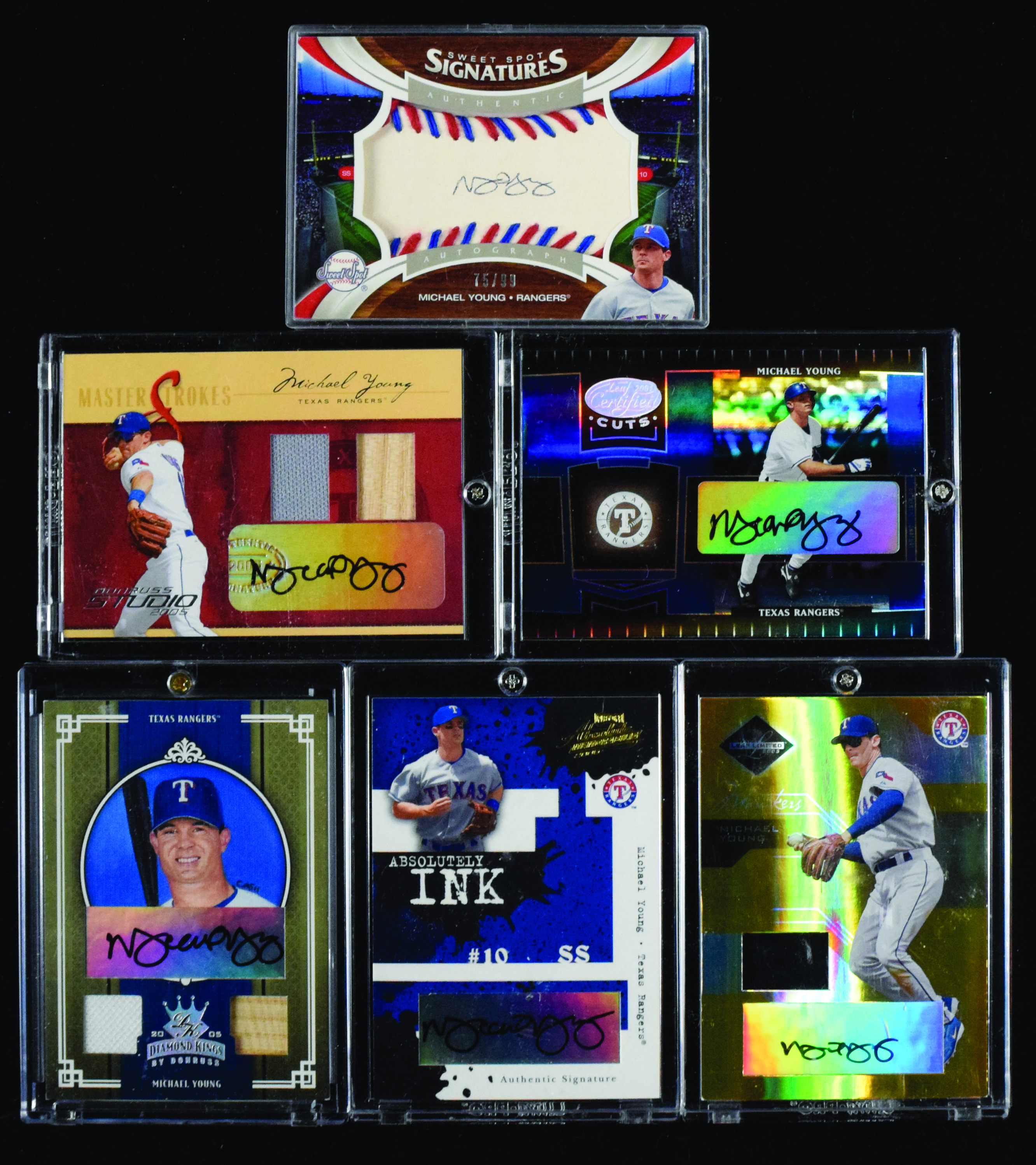 Description:Lot of (15) Michael Young signed insert cards including serial #ed & relics (NM-NM/MT overall). Incl. 2004 Leaf Certified Cuts "Marble Signature Blue" #189 signed by Young (#ed 58/75), 2004 Upper Deck Etchings "Etched in Time Autograph Black" #ET-MY signed by Young (#ed 1225/1325), 2005 Topps Pack Wars "Autographs" #PWA-MY signed by Young, 2005 Bowman Sterling "Original Autographs" 2005 Bowman #53 signed by Young (#ed 17/92), 2005 Donruss Diamond Kings "Signature Materials Framed Blue" #230 signed by Young (#ed 41/50), 2005 Donruss Prime Patches "Portraits Autos" #P-21 signed by Young, 2005 Donruss Studio "Masterstrokes Signatures Combos" #MS-13 signed by Young (#ed 9/10), 2005 Fleer Ultra "Season Crowns Autos" #157 signed by Young (#ed 66/199), 2005 Leaf Limited "Monikers Material Jersey Prime Gold" #38 signed by Young (#ed 64/100), 2005 Playoff Absolute Memorabilia "Absolutely Ink" #AI-129 signed by Young (#ed 70/75), 2005 UD Artifacts "Auto Facts" #MY signed by Young (#ed 156/599), 2005 UD Trilogy "Generations Present Signatures Silver" #PR-MY signed by Young (#ed 152/199), 2006 Topps Allen & Ginter "Framed Mini Autos" #AGA-MY signed by Young, 2006 UD Ovation "Spotlight Signatures" #SS-MY signed by Young, 2006 UD Sweet Spot "Signatures Red-Blue Stitch Black Ink" #135 signed by Young (#ed 75/99). Sigs rate 8 to 10 out of 10: NM-NM/MT overall