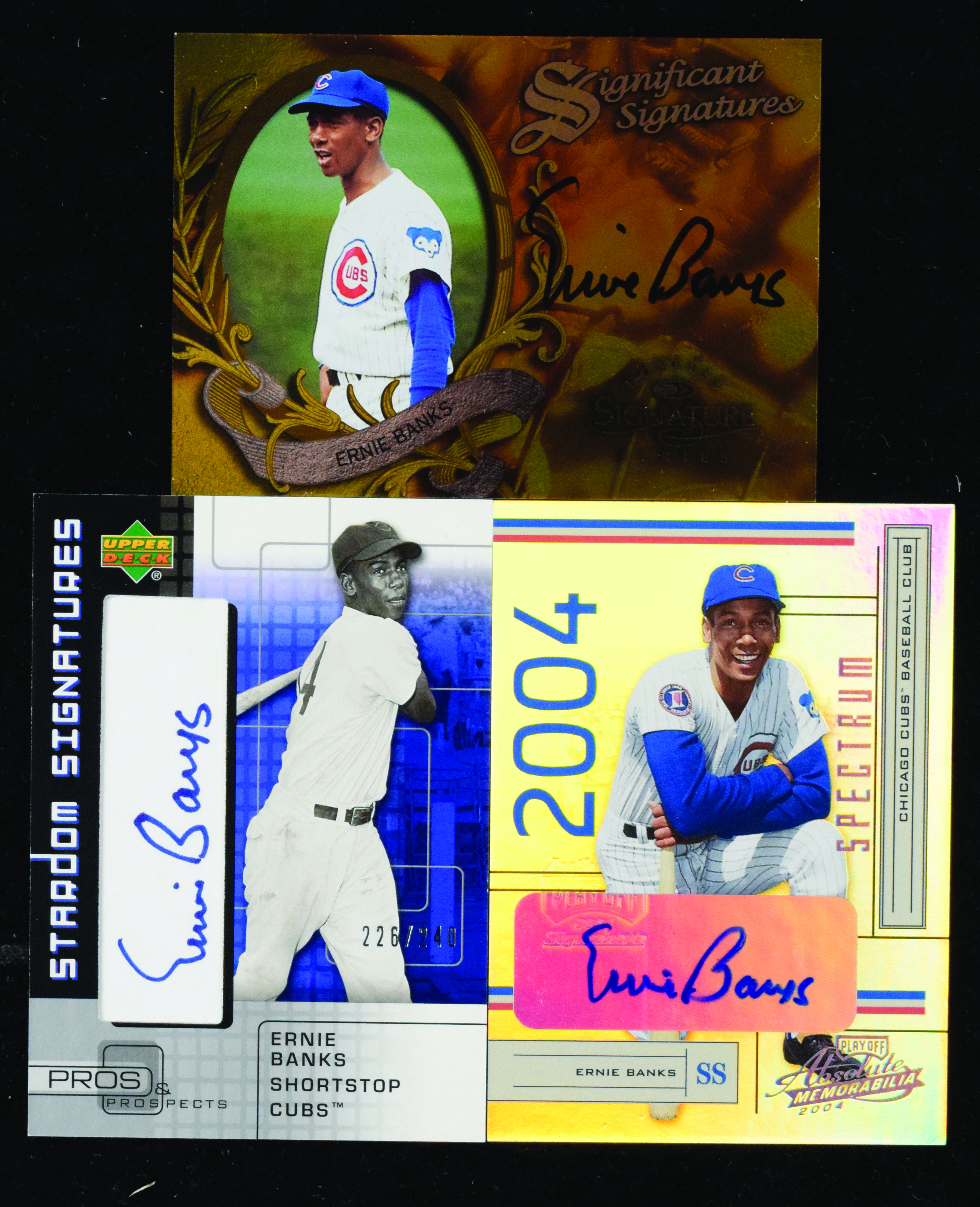 Description:Lot of (3) Ernie Banks signed serial numbered insert cards (NM-NM/MT). Includes 1997 Donruss Signature Series "Significant Signatures" signed by Banks (#ed 1633/2000), 2004 Playoff Absolute Memorabilia "Signature Spectrum Gold" #47 signed by Banks (#ed 99/100), and 2005 Upper Deck Pros & Prospects "Stardom Signatures" #EB signed by Banks (#ed 226/240). Signatures rate 8 to 10 out of 10: NM-NM/MT