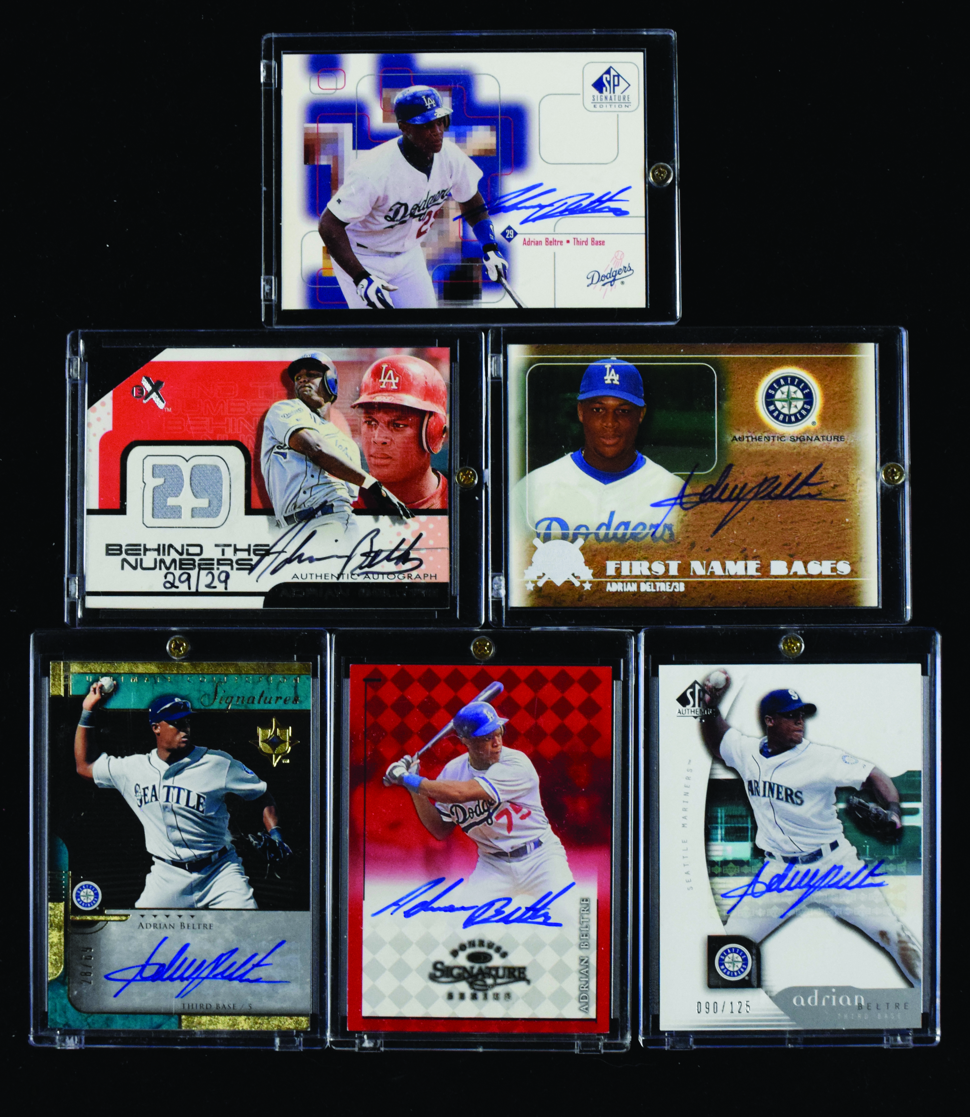 Description:Lot of (8) Adrian Beltre signed insert cards including rookie & serial numbered (EX/MT-NM/MT). Includes 1998 Donruss Signature Series "Autographs" signed by Beltre (EX/MT minor corner wear), 1999 SP Signature Edition "Autographs" #ABe signed by Beltre, 2000 Upper Deck Ionix "UD Authentics" #AB signed by Beltre, 2001 Fleer E-X "Behind the Numbers Game Jersey Autograph" signed by Beltre (#ed 29/29), 2005 Fleer National Pastime "First Name Bases Autograph White" #FNB-AB signed by Beltre (#ed 48/48), 2005 SP Collection "SP Authentic Signatures" #4 signed by Beltre (#ed 90/125), 2005 Upper Deck Origins "Signatures" #AB1 signed by Beltre, and 2005 Upper Deck Ultimate Collection "Signatures" #US-AB signed by Beltre (#ed 28/69). Signatures rate 8 to 10 out of 10: EX/MT-NM/MT