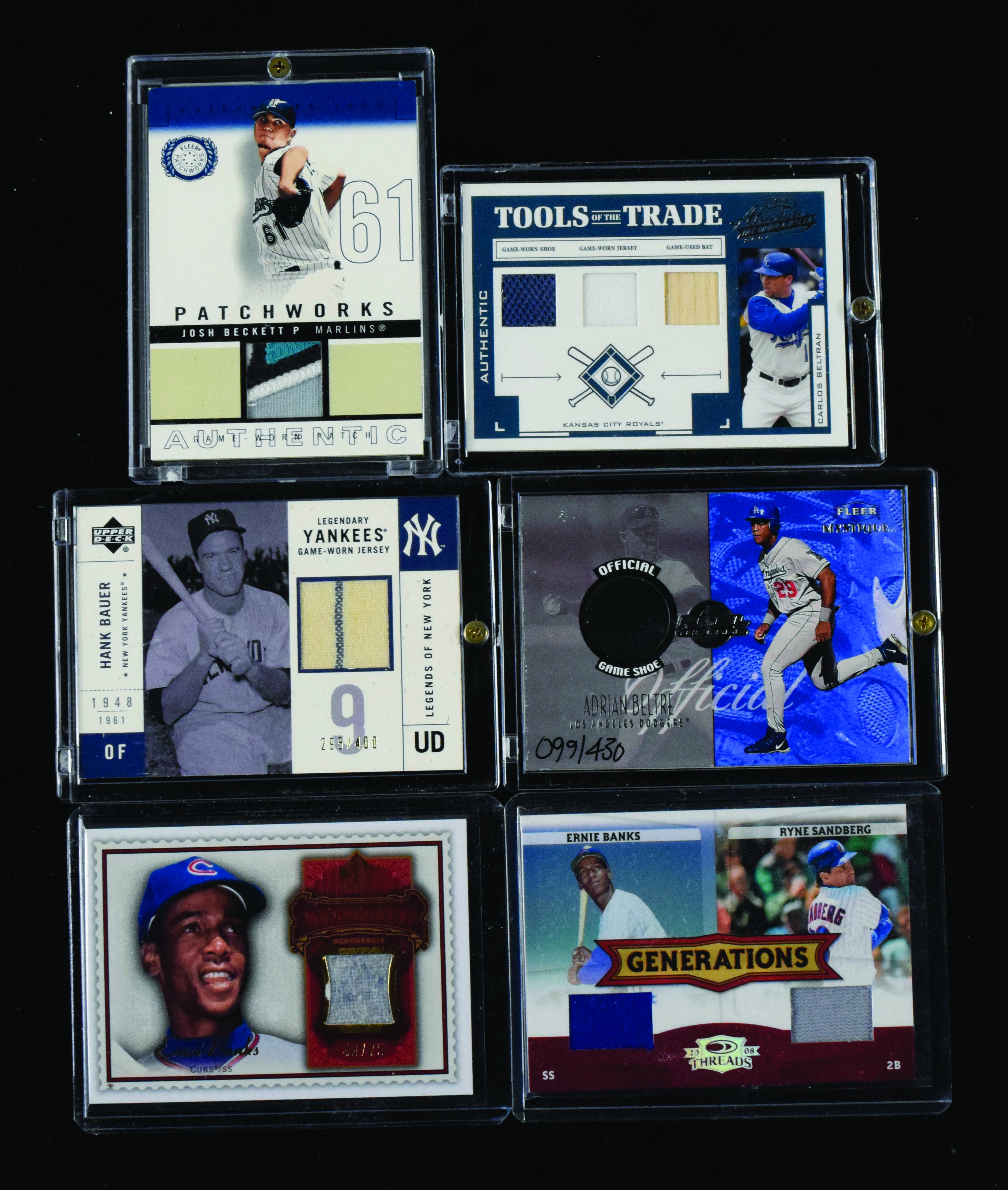 Description:Lot of (47) baseball game used relic swatch insert cards including (7) Ernie Banks (NM-NM/MT overall). Includes dual-relics card of Ryne Sandberg / Ernie Banks (#ed 8/15). Remainder are individual player cards: (7) Ernie Banks, (11) Adrian Beltre, (6) Hank Bauer, Dusty Baker, (2) Albert Belle, (12) Carlos Beltran, (5) Josh Beckett, and (2) Jose Bautista: NM-NM/MT overall