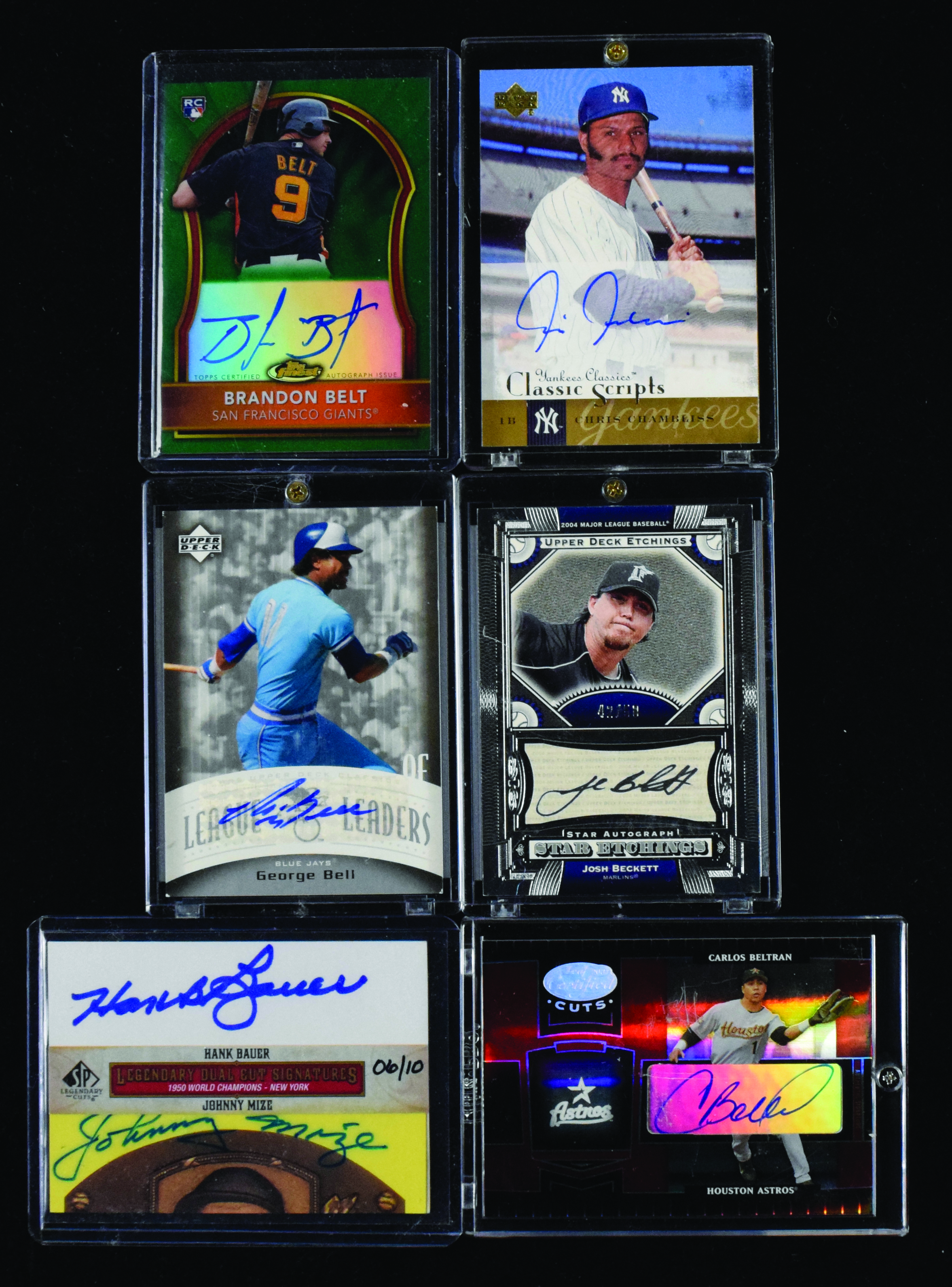 Description:Lot of (38) signed baseball rookie and insert cards (NM-NM/MT overall). Includes dual-signed Johnny Mize / Hank Bauer (#ed 6/10), multi-signed Adrian Beltre / Blake DeWitt / John Raglani, dual-signed Carlos Beltran / Corey Patterson, dual-signed Homer Bailey / Jeremy Sowers. Remainder are individial signed cards: (6) Carlos Beltran, George Bell, (3) Josh Beckett, Chris Chambliss, (2) Josh Bell, (6) Brandon Belt, Angel Berroa with "ROY 03" inscription, (6) Gordon Beckham, (4) Tim Beckham, (3) Bruce Chen, and Jeremy Beckham. Signatures rate 7 to 10 (avg 9) out of 10: NM-NM/MT overall