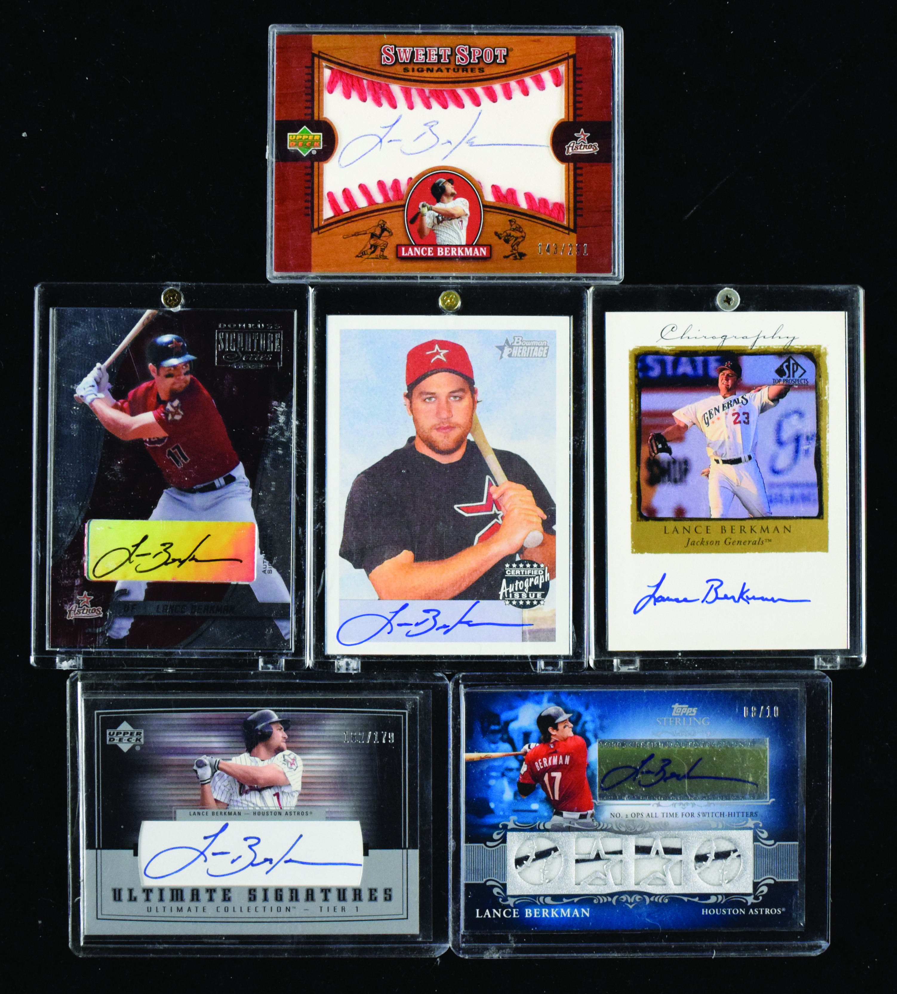 Description:Lot of (8) Lance Berkman signed insert cards including serial numbered (NM-NM/MT). Includes 1999 SP Top Prospects "Chirography" #LB signed by Berkman, (2) 2002 Bowman Heritage "Autographs" #BHA-LB signed by Berkman, 2002 Upper Deck Ultimate Collection "Signatures Tier 1" #LB1 signed by Berkman (#ed 162/179), 2002 Upper Deck Sweet Spot "Signatures" #LB signed by Berkman (#ed 143/291), 2003 Donruss Signature Series "Autographs" #38 signed by Berkman, 2003 Upper Deck Patch Collection "Signature Patches" #SP-LB signed by Berkman, and 2009 Topps Sterling "Career Chronicles Relic Quad Autographs" #4SCA-28 signed by Berkman (#ed 8/10). Signatures rate 8/9 to 10 out of 10: NM-NM/MT