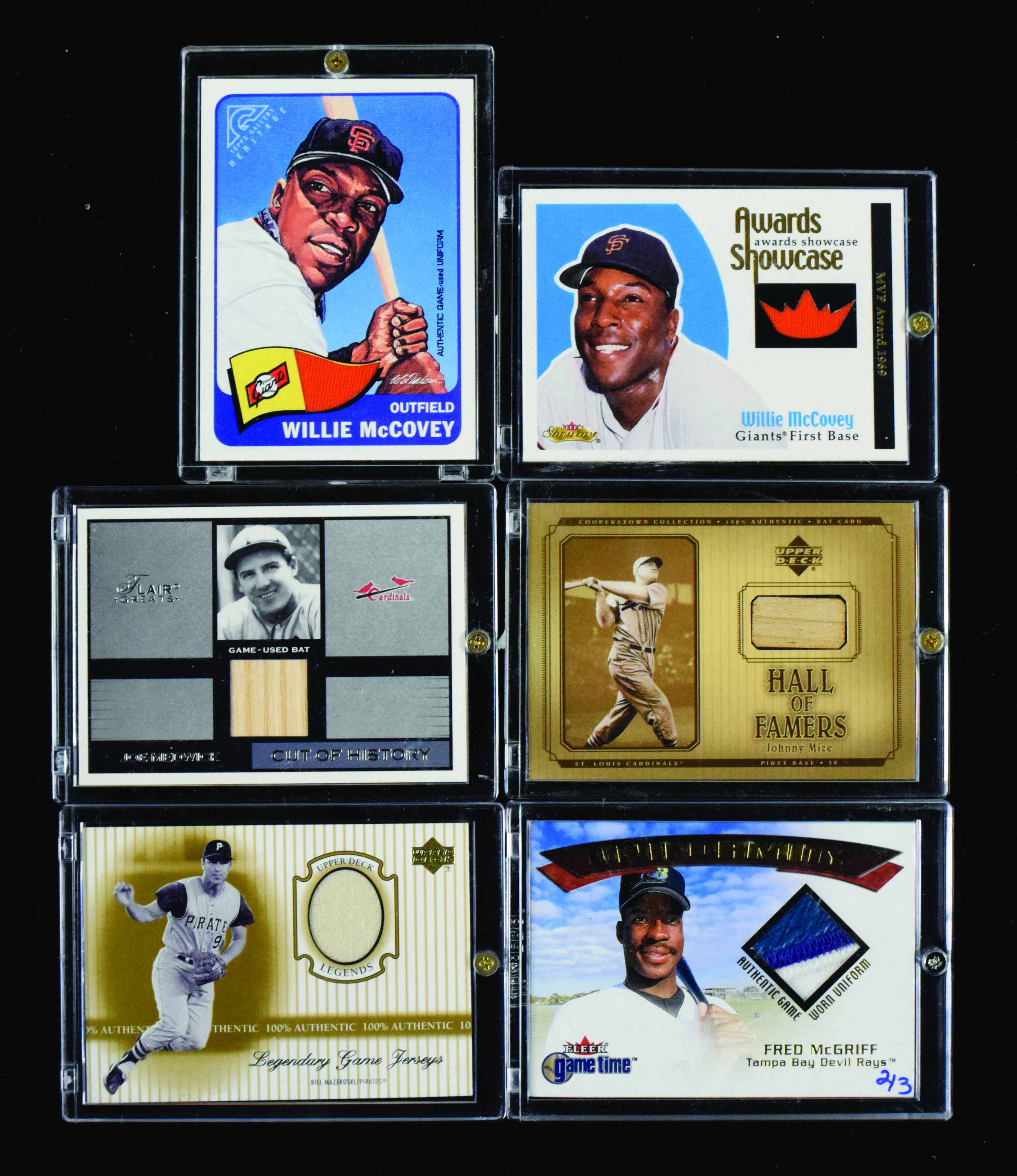 Description:lot of (24) Baseball HOFers game used relic swatch insert cards (NM-NM/MT overall). Includes (4) Johnny Mize, (9) Willie McCovey, Joe Medwick, (4) Bill Mazeroski, and (6) Fred McGriff: NM-NM/MT overall