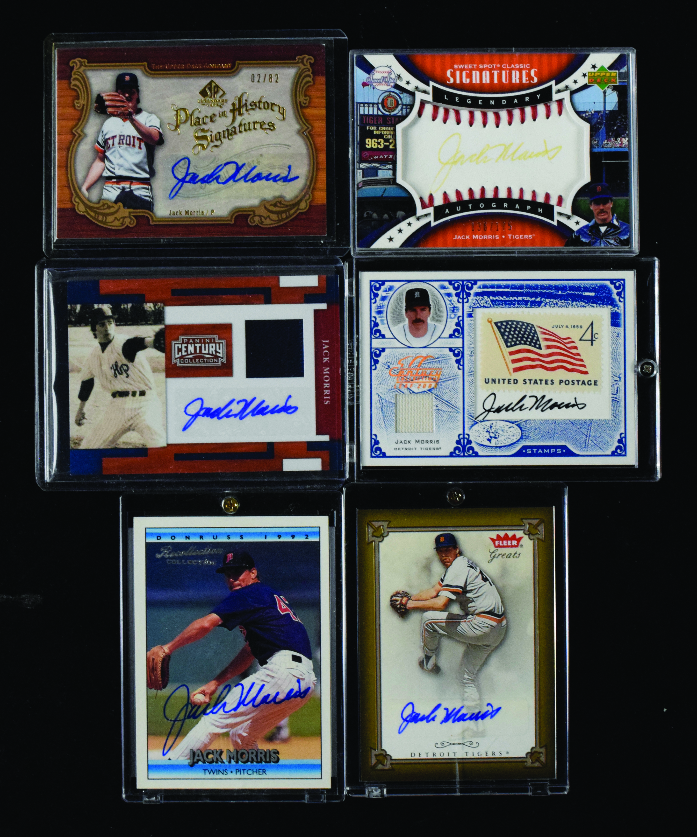 Description:Lot of (8) Jack Morris signed insert cards including serial #ed and relics (NM-NM/MT). Includes 2000 Fleer Greats Of The Game "Autographs" signed by Morris, 2004 Donruss Timelines "Recollection Collection" 1992 Donruss #216 signed by Morris (#ed 22/59), 2004 Fleer Greats Of The Game "Autographs" #GBA-JM2 signed by Morris, 2005 Donruss Greats "Signatures Gold HoloFoil" #36 signed by Morris, 2005 Leaf Century "Stamps Signature Material USA Flag" #S-38 signed by Morris (#ed 28/37), 2006 SP Legendary Cuts "Place in History Signatures" #PH-JM signed by Morris (#ed 2/82), 2007 Upper Deck Sweet Spot Classic "Signatures Red Stitch" #SPS-MO signed by Morris (#ed 136/175), and 2010 Panini Century "Materials Jerseys" #62 signed by Morris (#ed 32/50). Signatures rate 6/7 (UD Sweet Spot Classic) to 10 (avg 8/9) out of 10: NM-NM/MT