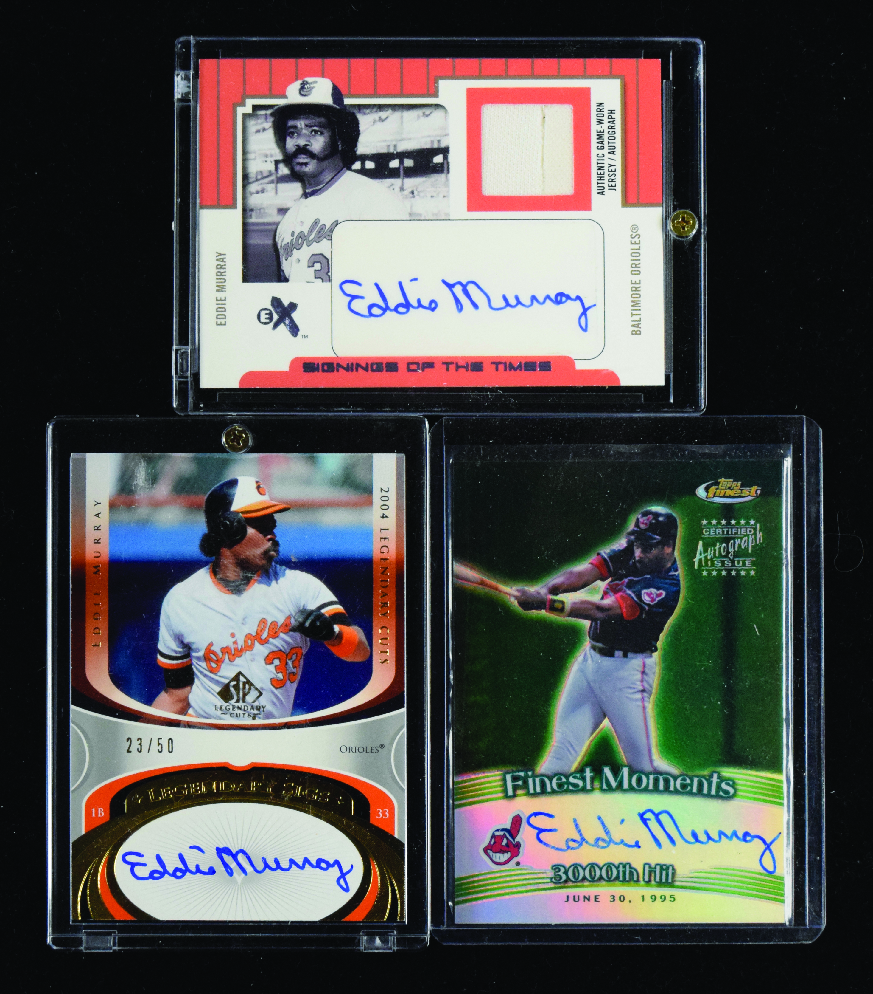 Description:Lot of (3) Eddie Murray signed insert cards (NM-NM/MT). Includes 2001 Topps Finest "Finest Moments Autographs Refractors" #FMA-EM signed by Murray, 2004 Fleer E-X "Signings of the Times Debut Year" #ST/EM jersey card signed by Murray (#ed 29/77), and 2004 SP Legendary Cuts "Legendary Sigs" #LS-EM signed by Murray (#ed 23/50). Signatures rate 7 (Topps Finest) to 10 (avg 9) out of 10: NM-NM/MT