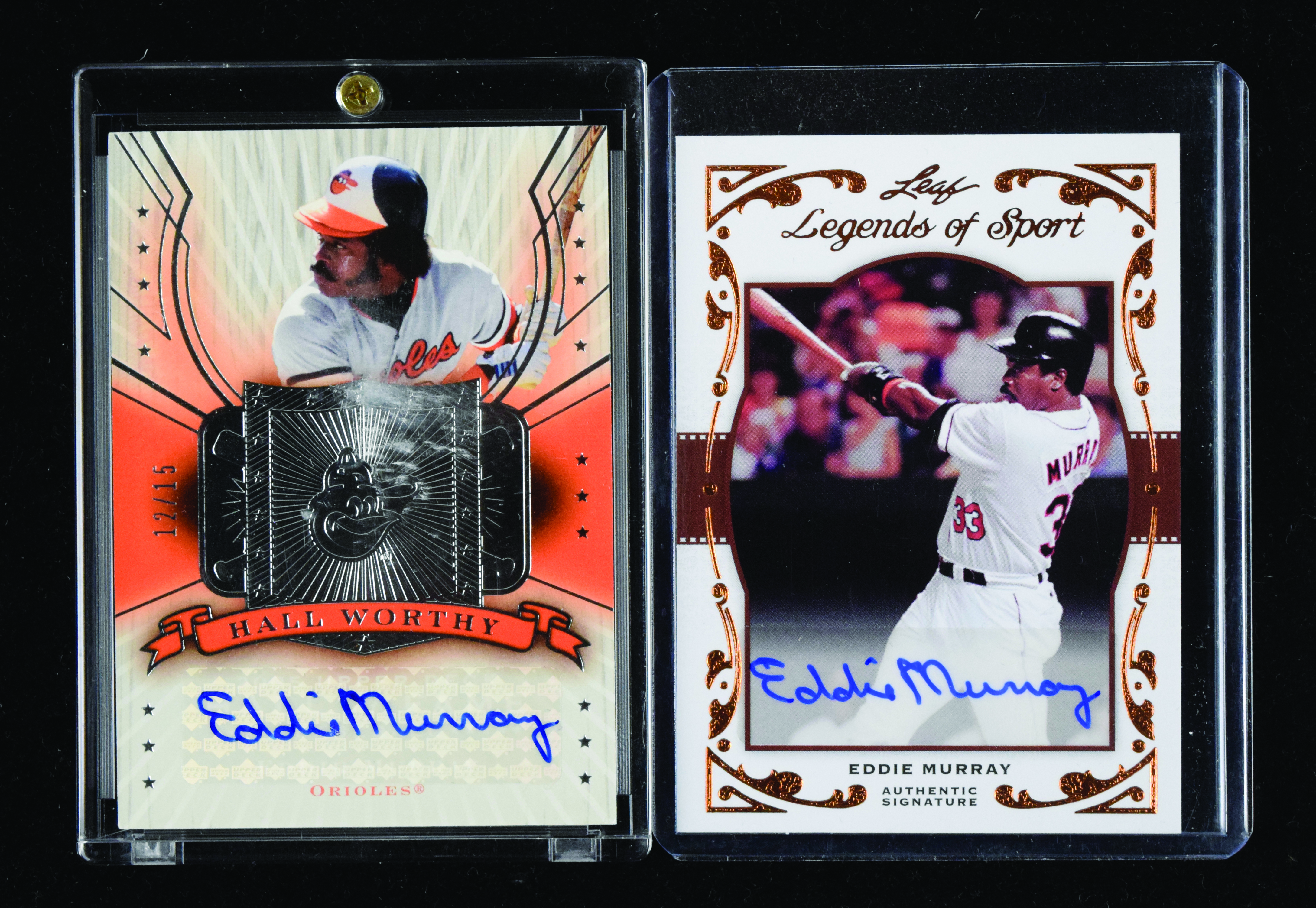 Description:Eddie Murray signed insert cards serial numbered out of 15 and 16 (NM-NM/MT). Includes 2005 Upper Deck Hall Of Fame "Hall Worthy Autograph Silver" #HW-EM1 signed by Murray (#ed 12/15), and 2011 Leaf Legends Of Sport #BA-27 signed by Murray (#ed 6/16). Signatures rate 9 to 10 out of 10: NM-NM/MT
