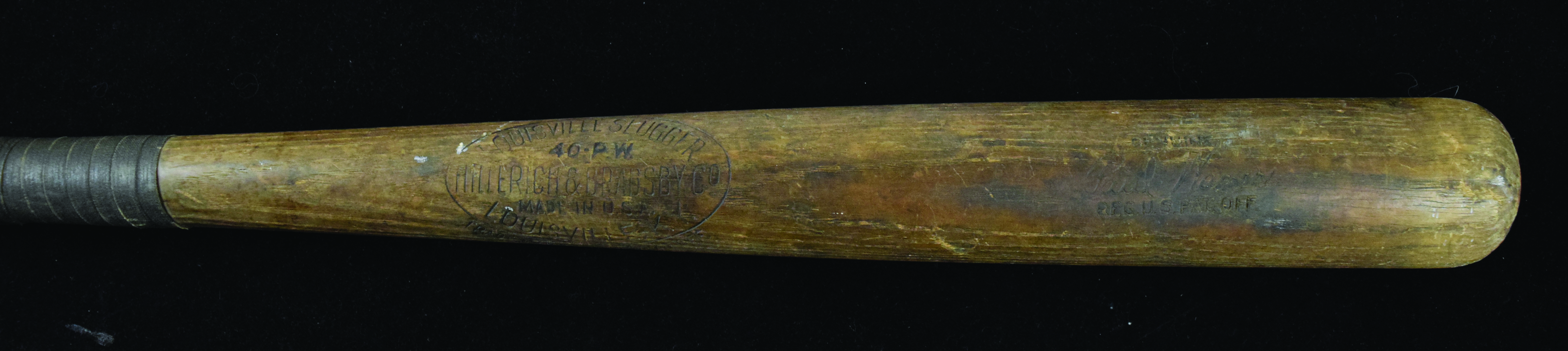 Description:Paul Waner vintage store model baseball bat, c.early-mid 1930s (VG). 36" Louisville Slugger 40-P.W. Paul Waner model bat with 1933-34 era labeling. Used, with barrel wear, and vintage tape applied over a handle crack: VG