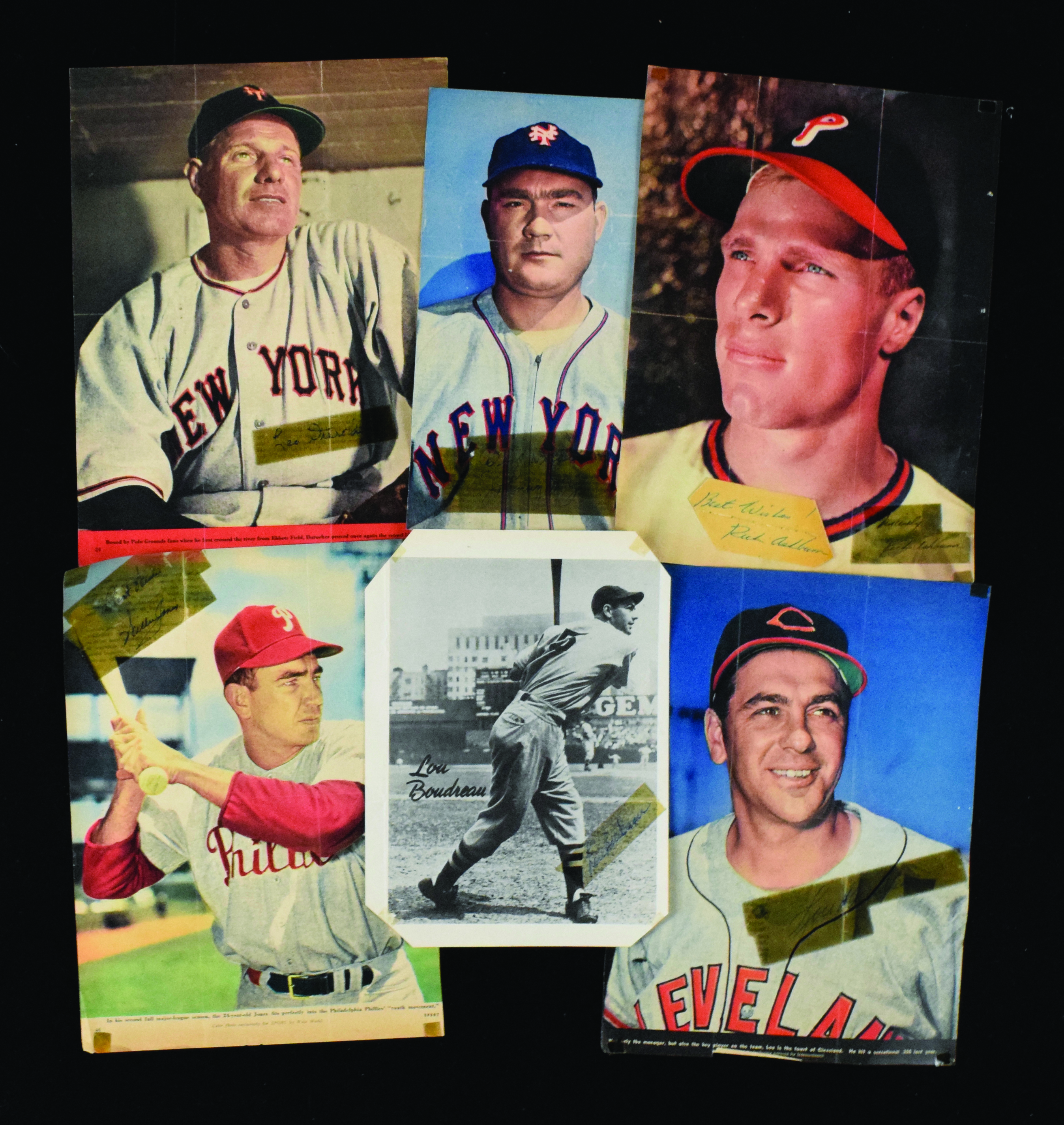 Description:Lot of (33) baseball autographs including HOFers (FR/GD-NM). Includes B.Selig ML ball signed by Cole Hamels, Rawlings Official League ball (toning) signed by Roy Oswalt, and B.Selig ML ball signed by Joe Blanton. Remainder are mostly vintage cut signatures taped to publication photos along with other signed flats. Includes (2) Richie Ashburn, (2) Enos Slaughter, Johnny Mize, (2) Lou Boudreau, Ralph Kiner (personalized), Leo Durocher, (2) Jim Konstanty, Charlie Keller, Willie Jones, Bob Elliott, (2) Howard Ehmke (one personalized), Ewell Blackwell, Bob Thomson (personalized), George Earnshaw, Eddie Stanky, Wally Westlake, Dick Sisler, (2) Bill Freehan (both personalized), Terry Moore, Cloyd Boyer, Eddie Robinson (personalized), Art Houtteman, Max Alvis (personalized), and Greg Masson. Signatures rate 3/4 to 9 (avg 7) out of 10. Most appear to average VG/EX-EX overall. Range: FR/GD-NM