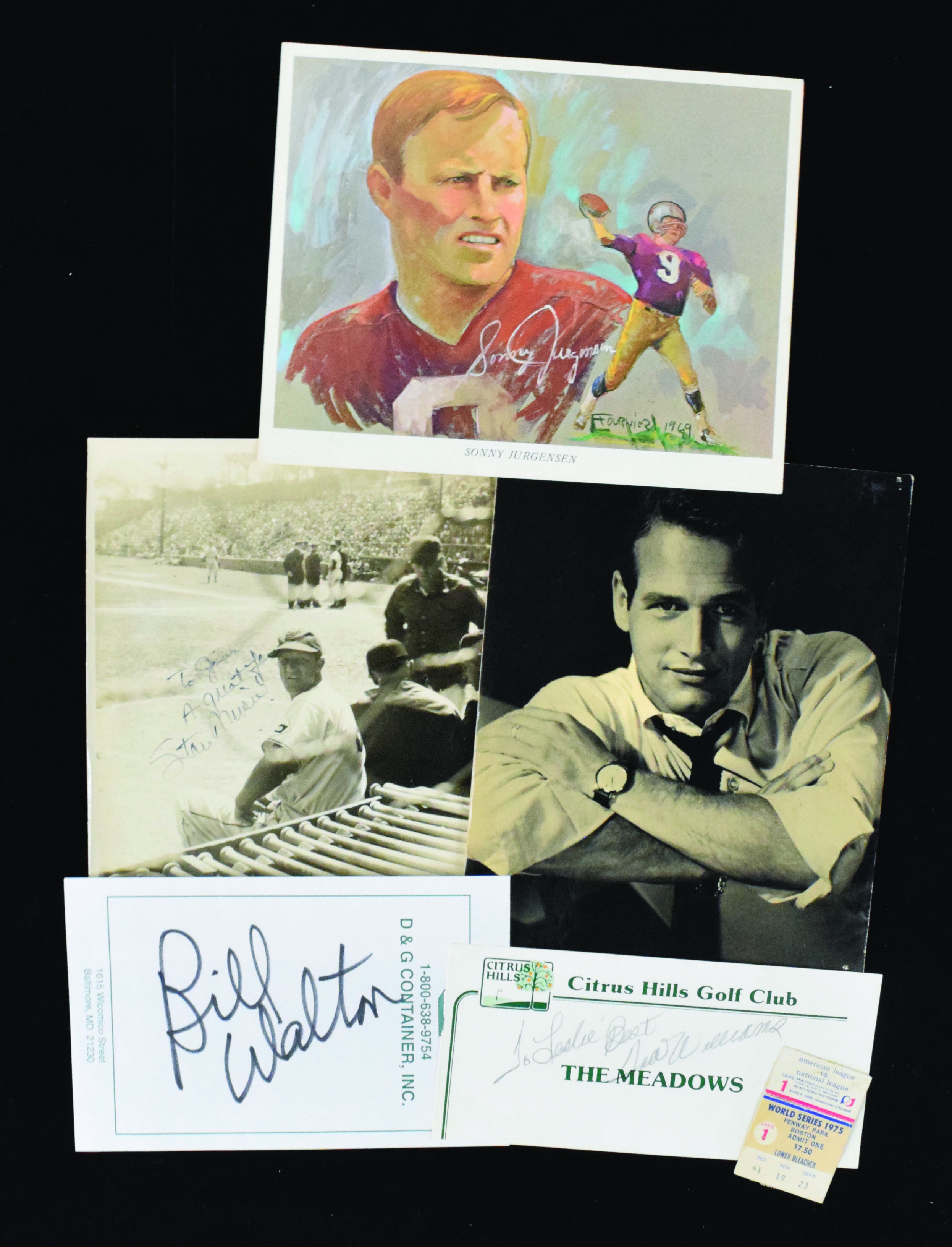 Description:Lot of assorted sports memorabilia and autographs including HOFers (PR/FR-NM). Autographs are mostly cut signatures along with some other signed flats: Stan Musial (personalized), Ted Williams (personalized), Joe Morgan, Gene Sarazen (personalized), Bill Walton, Julius Erving (personalized), Oscar Robertson signed "Big O" (personalized), Jim Palmer, Jim Rice (personalized), Tony Perez, Earl Weaver, Bob Cox, George Foster, Ted Kluszewski, Harry Walker, Cesar Cedeno, Don Wilson, Fred Gladding, Doug Rader, Roger Metzger, Tommy Helms, Jim Ray, Bob Stinson, and (2) John Edwards (one personalized). Signatures rate 3/4 to 9 (avg 7/8) out of 10. Also includes (7) ticket stubs: 6/24/1975 Chicago Cubs at Montreal Expos, 1975 World Series Game 1, (3) 1976 NLCS Game 1, 7/26/1976 New York Mets at Philadelphia Phillies, and 7/13/1977 St. Louis Cardinals at Phillies (PR/FR-FR/GD); (4) High's Dairy 1969 Washington Redskins 8"x10" prints: Sonny Jurgensen, Chris Hanburger, Brig Owens, and Pat Richter (VG-EX); 1972 Freelance #168 Paul Newman 8"x10" photo (GD); 1979 Baltimore Orioles pocket schedule, and a few other items. Most pieces appear to average VG-VG/EX overall. Range: PR/FR-NM