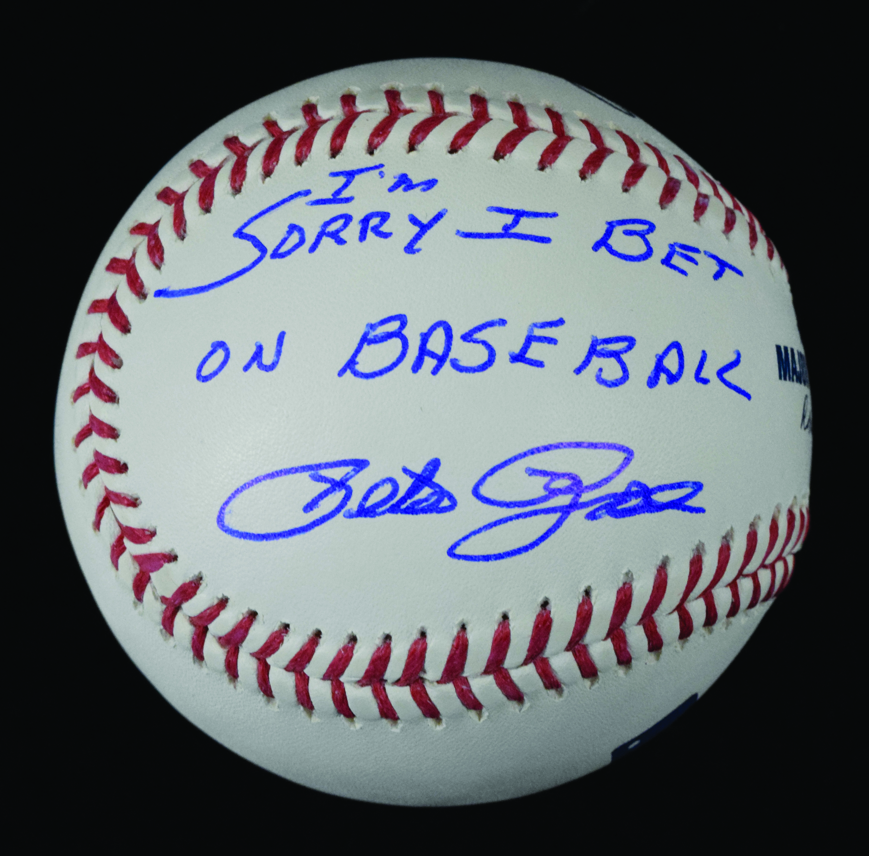 Description:Pete Rose signed baseball inscribed "I'm Sorry I Bet On Baseball" (NM). R.Manfred ML ball signed by Rose in blue ink with "I'm Sorry I Bet On Baseball" inscription. Signature rates 8/9 out of 10. Includes COA from the Cincinnati Reds HOF Museum: NM