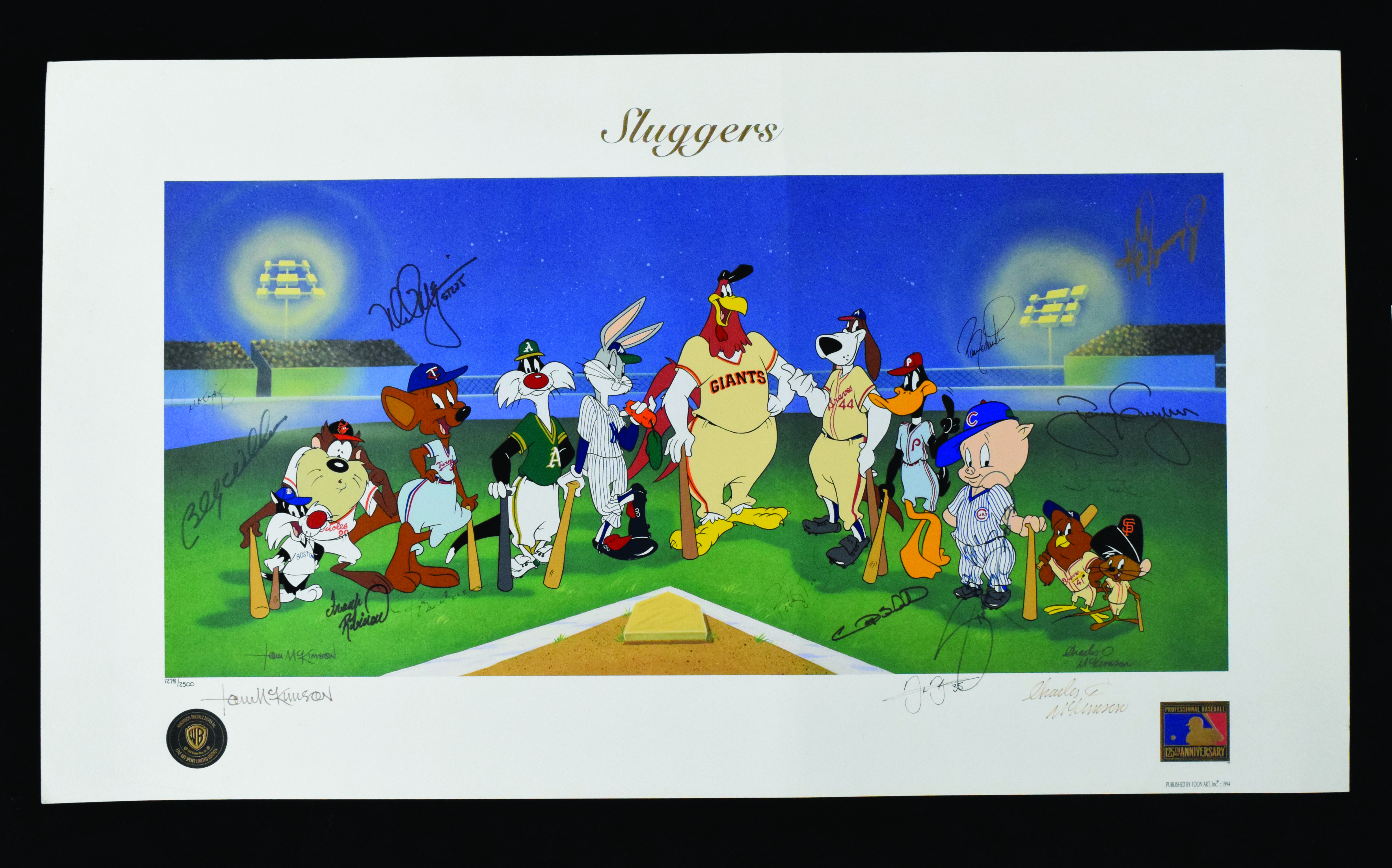 Description:Baseball stars & HOFers multi-signed limited edition Looney Tunes print from the Joe Black collection (EX/MT). Approx. 18.5"x32.5" "Sluggers" print signed by (13) including Tony Gwynn, Frank Robinson, Ken Griffey Jr, Frank Thomas, Billy Williams, Rod Carew, Barry Larkin, Mark McGwire, Gary Sheffield, Sammy Sosa, Juan Gonzalez, Cecil Fielder, and Bobby Bonilla. Signatures rate 3/4 (Fielder) to 10 (avg 7) out of 10. Also signed by animators Charles and Tom McKimson. Numbered 1278/5000. Includes COA signed by Joe Black stating he obtained the autographs himself. Very minor cinkles, and some light edge wear on the back: EX/MT