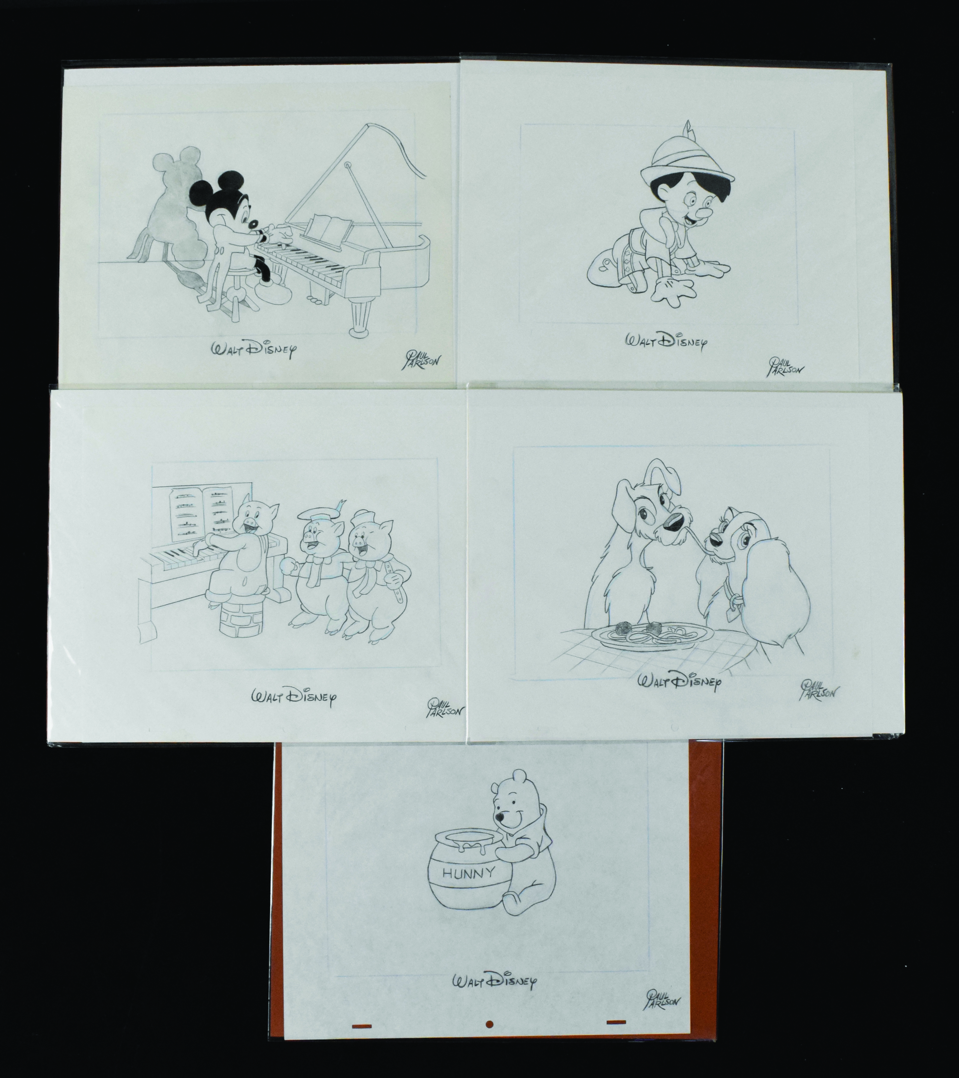 Description:Lot of (5) Walt Disney cartoon drawings signed by animator Paul Carlton (EX/MT-NM). Each sketch measures around 10"x12.5" (some slightly smaller or larger). Includes "Mickey at The Piano from Orphan's Benefit", "The Three Little Pigs", "Pinocchio", "Lady and the Tramp", and "Winnie the Pooh". All are signed by Carlson in pencil. Signatures rate 8 to 9/10 out of 10: EX/MT-NM