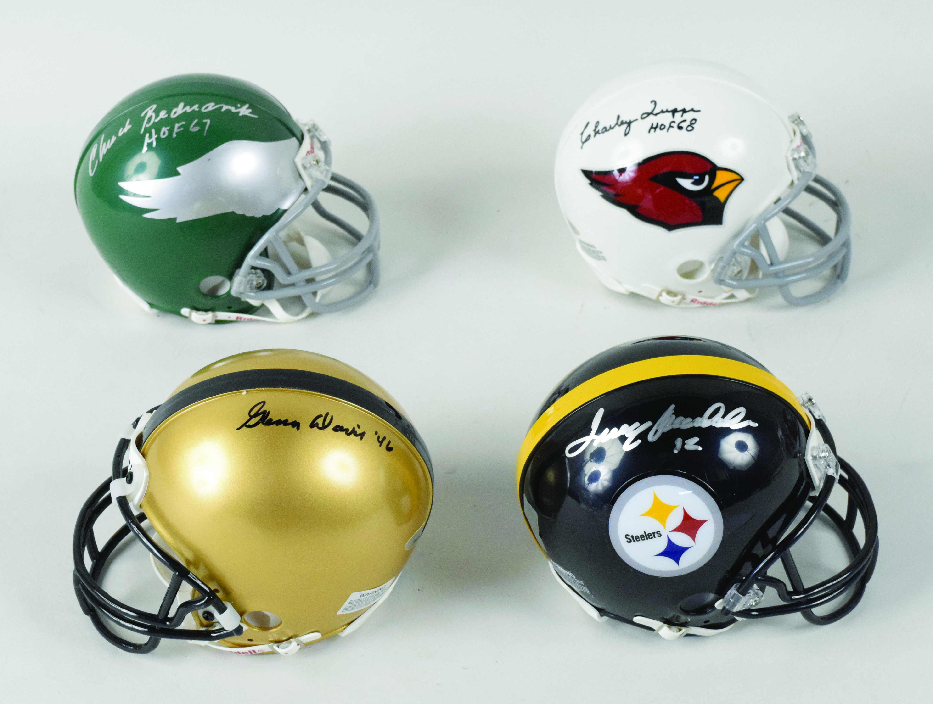 Description:Chuck Bednarik, Charley Trippi, Terry Bradshaw, Glenn Davis signed mini helmets (NM-NM/MT). Includes an Eagles mini helmet signed by Chuck Bednarik with "HOF 67" inscription (Fanatics), Cardinals mini helmet signed by Charley Trippi with "HOF 68" inscription (Tri-Star), Steelers mini helmet signed by Terry Bradshaw (Leaf and Bradshaw authenticated), Army mini helmet signed by Glenn Davis with "46" Hesiman trophy year inscription (Tri-Star). Signatures rate 8 to 9/10 out of 10: NM-NM/MT
