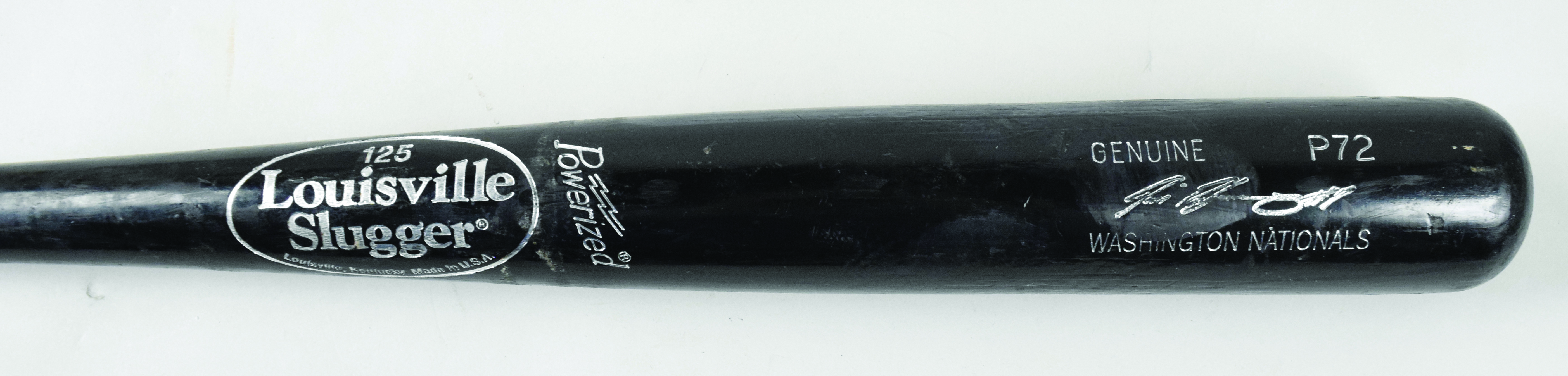 Description:2010 Ivan Rodriguez game used baseball bat (EX outstanding use). 34" Louisville Slugger P72 Ivan Rodriguez model bat with his #7 written on the knob and on the end of the bat, along with production date and specifications stamped on the knob. Superb use with numerous ball marks, heavy grain swelling, and pine tar caked on the handle. Includes certificate of provenance from Rodriguez: EX