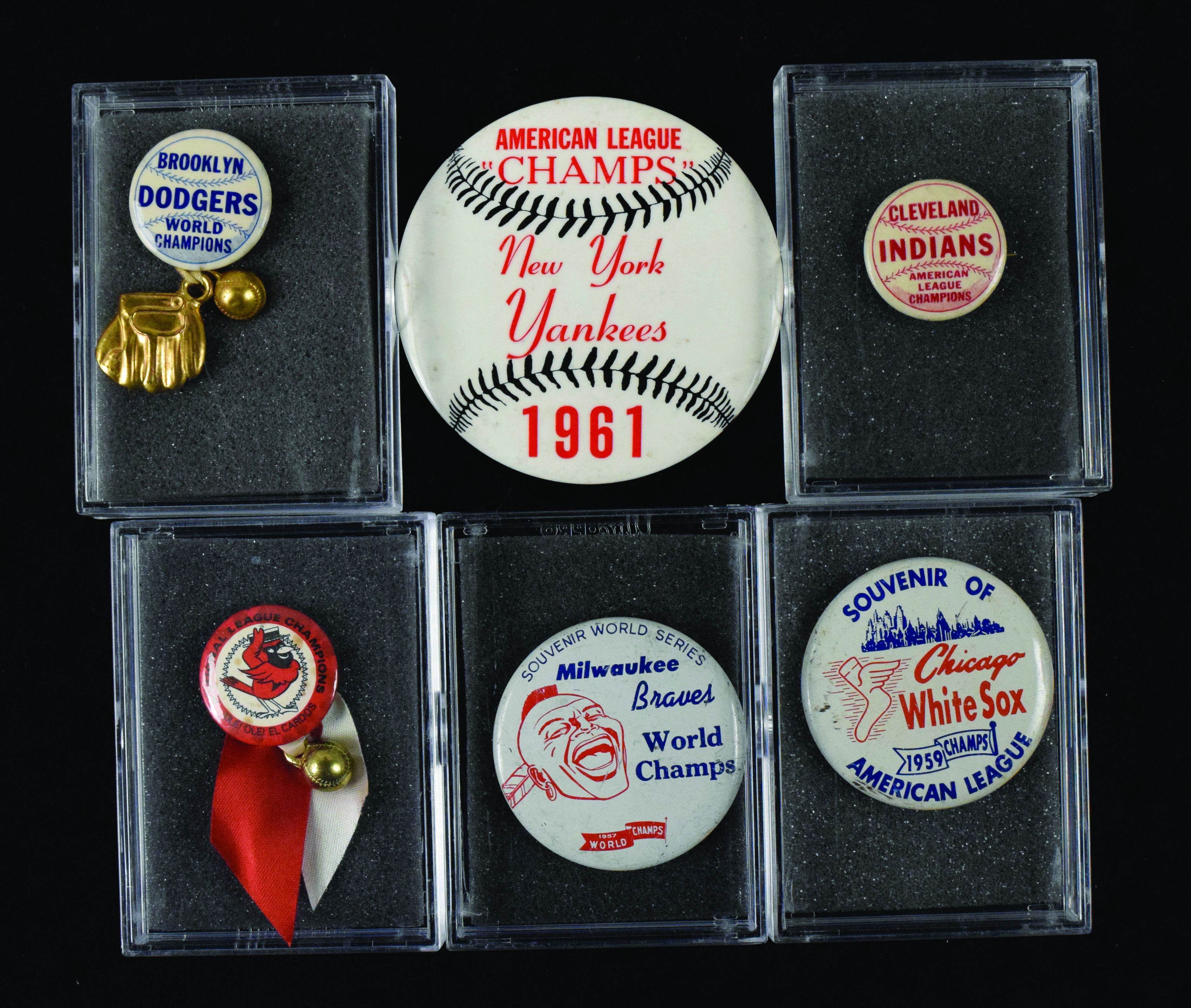 Description:Lot of (6) baseball championship team pins from 1954-1967 (VG-EX/MT). Includes 1954 Cleveland Indians AL Champions (EX), Brooklyn Dodgers 1955 World Champions (EX-EX/MT), Milwaukee Braves 1957 World Champs (EX), 1959 Chicago White Sox AL Champs (VG/EX-EX), 1961 New York Yankees AL Champs (EX/MT), and 1967 St. Louis Cardinals NL Champions (VG-VG/EX).