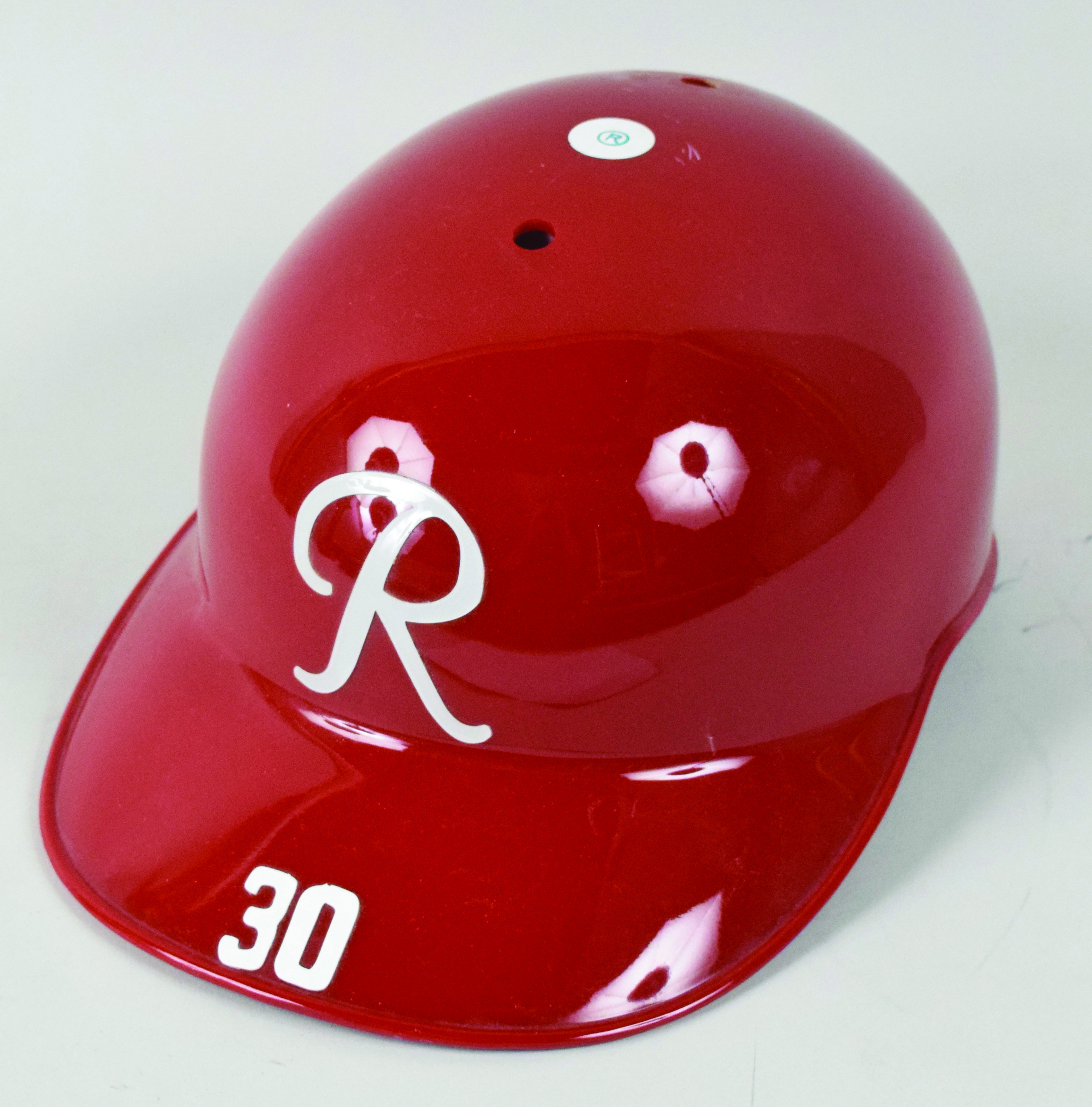 Description:Miguel Olivo game worn 2012 Seattle Mariners turn back the clock game catcher's helmet - MLB Authenticated EX). Rawlings / American Baseball Cap size 7-1/8 Seattle Rainiers 1955 style catcher's helmet with #30 decals on the top and bottom of the brim. Olivo wore the helmet during the May 26th turn back the clock game against the Angels (caught the whole game, batted 7th, and scored a run). MLB Authenticated serial #EK054321 hologram sticker is on the helmet: EX