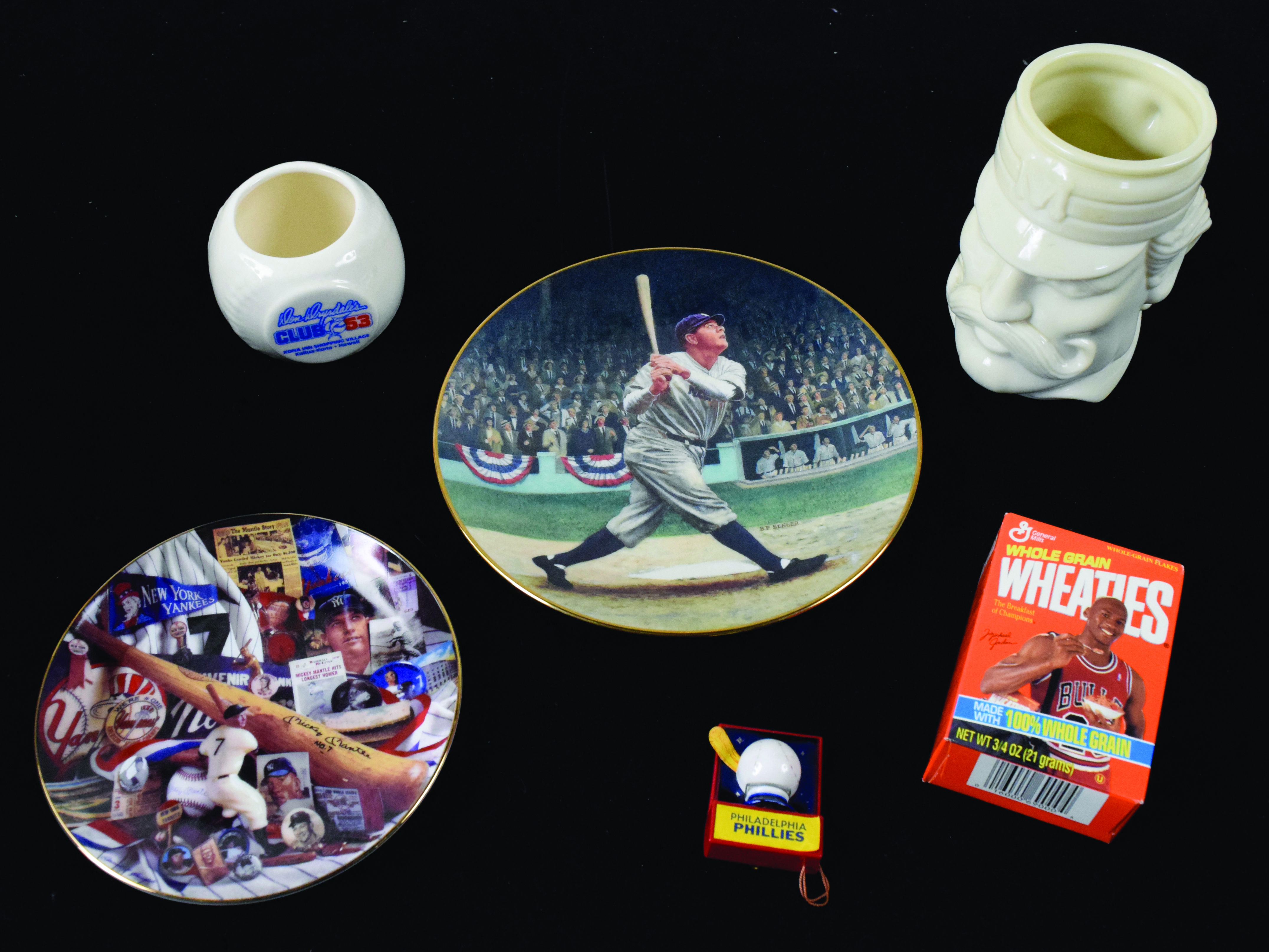 Description:Lot of assorted sports memorabilia from 1951-modern (VG-NM/MT). Includes 1951 "The Thrilling Story Of Joe DiMaggio" publication (VG), 5.5" tall City Of Burbank plastic mini trophy with "St. Louis Browns Spring Training 1951" band around the base (VG/EX), c.1950s Philadelphia Phillies pin (VG), 5"x6.75" Pittsburgh Pirates 1960 World Series ashtray, c.1970s-80s Joe DiMaggio 1-liter glass jar, c.1980s Mudville Nine mug by Avon, c.1980s Don Drysdale's Club 53 ceramic baseball shaped display piece, c.early 1990s unopened mini box of Wheaties picturing Michael Jordan, c.1990s Don Mattingly mug, 1992 Babe Ruth plate by Delphi, 1993 Joe DiMaggio plate by Bradford Exchange, (3) 1995 Mickey Mantle plates by Sports Impressions, and Yankee Stadium 4/25/1999 Joe DiMaggio tribute publication: VG-NM/MT
