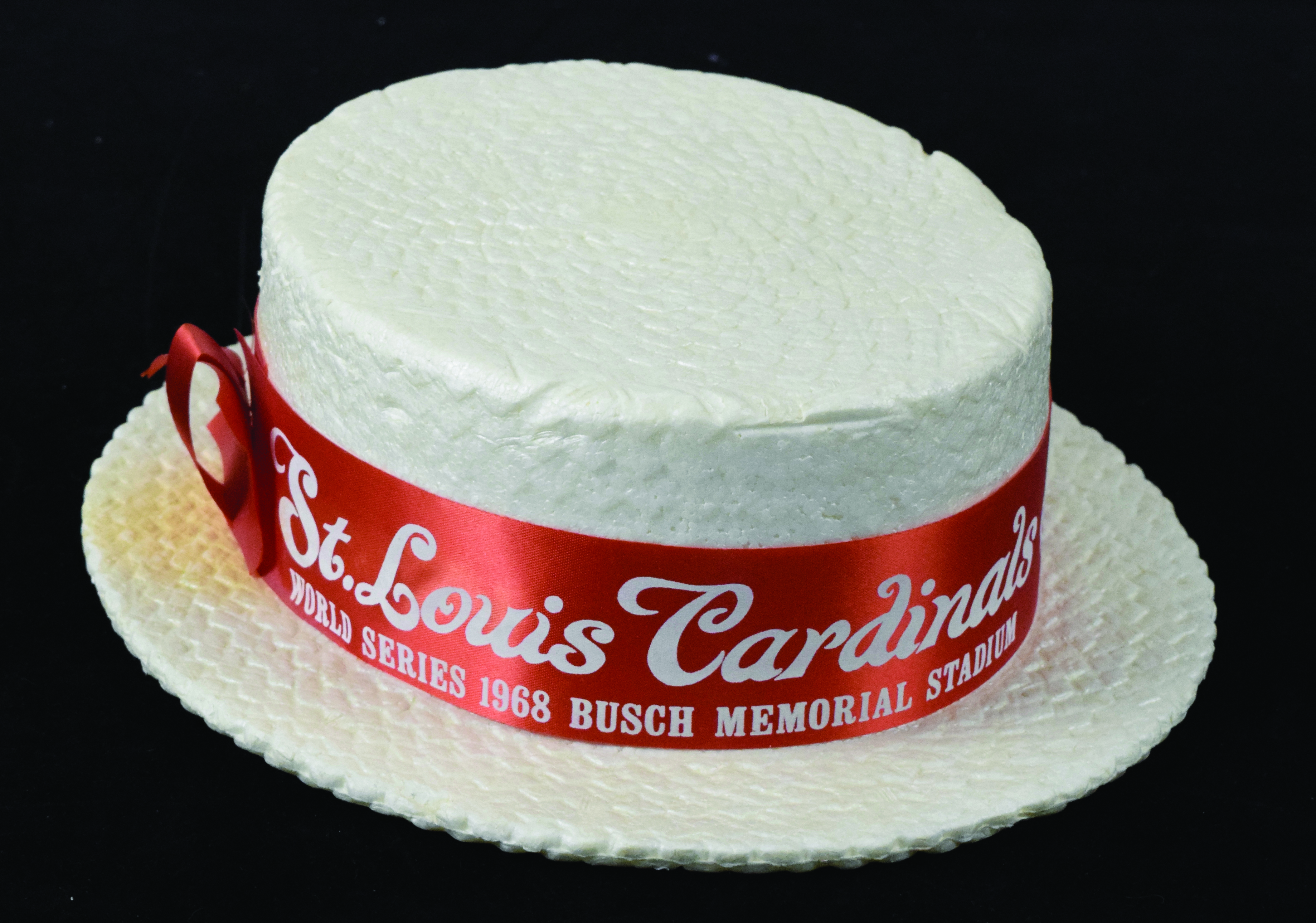 Description:St. Louis Cardinals 1968 World Series hat (EX/MT). Brown-Flatt Incentives foam hat with "St. Louis Cardinals" "World Series 1968 Busch Memorial Stadium" band still intact. Stain on the white surface near the ribbin tie, with minimal wear otherwise: EX/MT