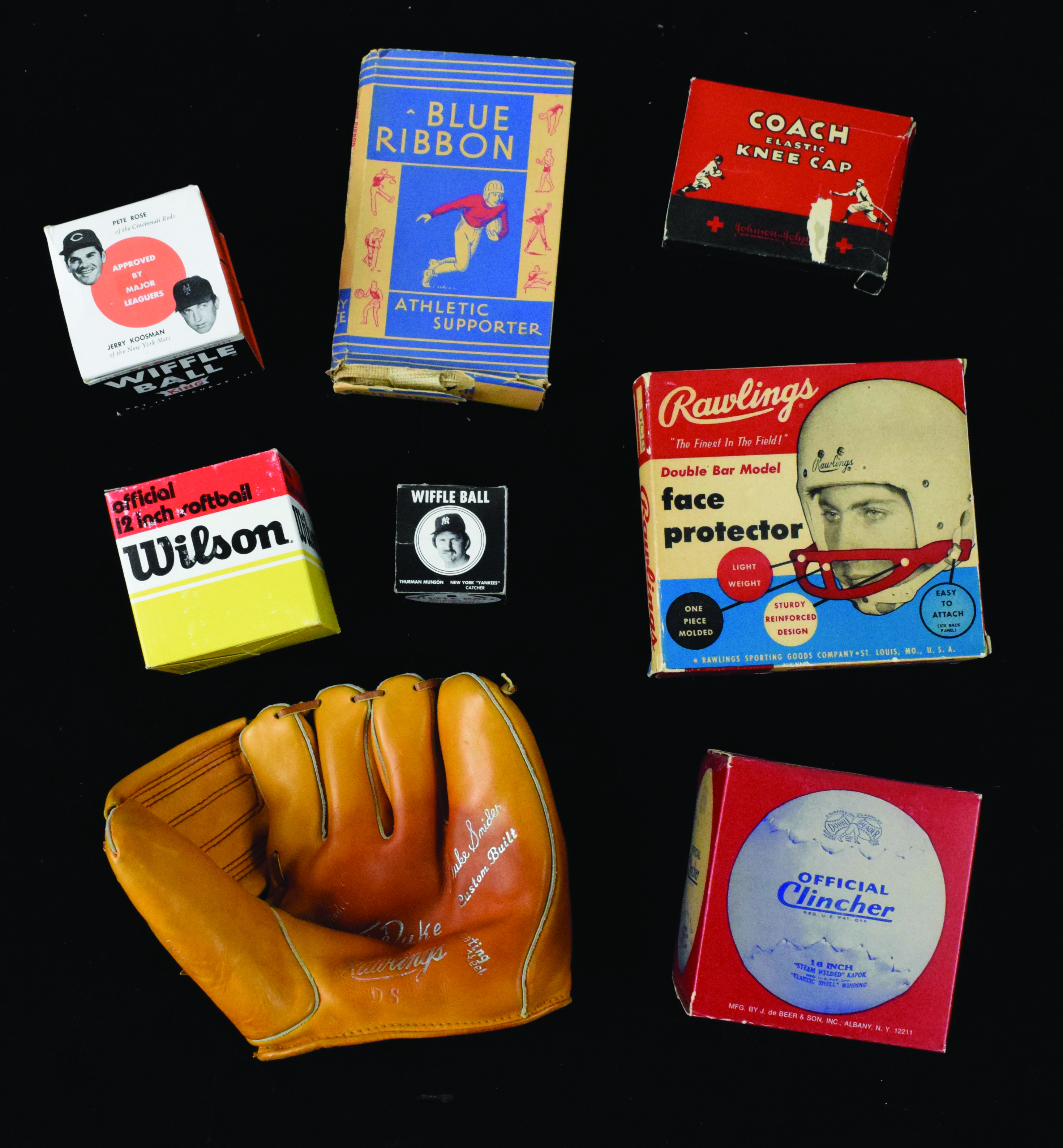 Description:Lot of vintage sports equipment, c.1930s-80s (VG-NM). Includes c.1930s Blue Ribbon athletic supporter still in original box (VG box), c.1940s-50s Johnson & Johnson elastic knee cap still in original box, c.1950s Rawlings DS "The Duke" Duke Snider model glove for right handed thrower (appears unused), c.1960s Rawlings football "double bar model face protector" still in original box, c.1960s J.deBeer "Clincher" softball still in original box, c.1970s wiffle ball still in box picturing Pete Rose and Jerry Koosman, c.1970s wiffle ball still in box picturing Thurman Munson, and c.1980s Wilson A9040 softball still in original box: VG-NM