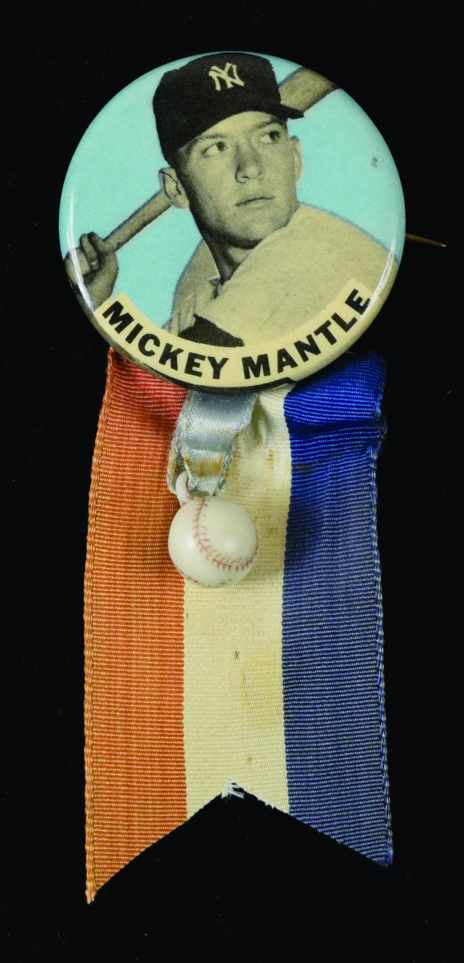 Description:Mickey Mantle PM10 Baseball Player Pin, c.1950s (EX). 1.75" blue background variation with name in strip along the bottom. Ribbon and baseball charm are still attached. Minimal wear to the front, but back has some rusting: EX