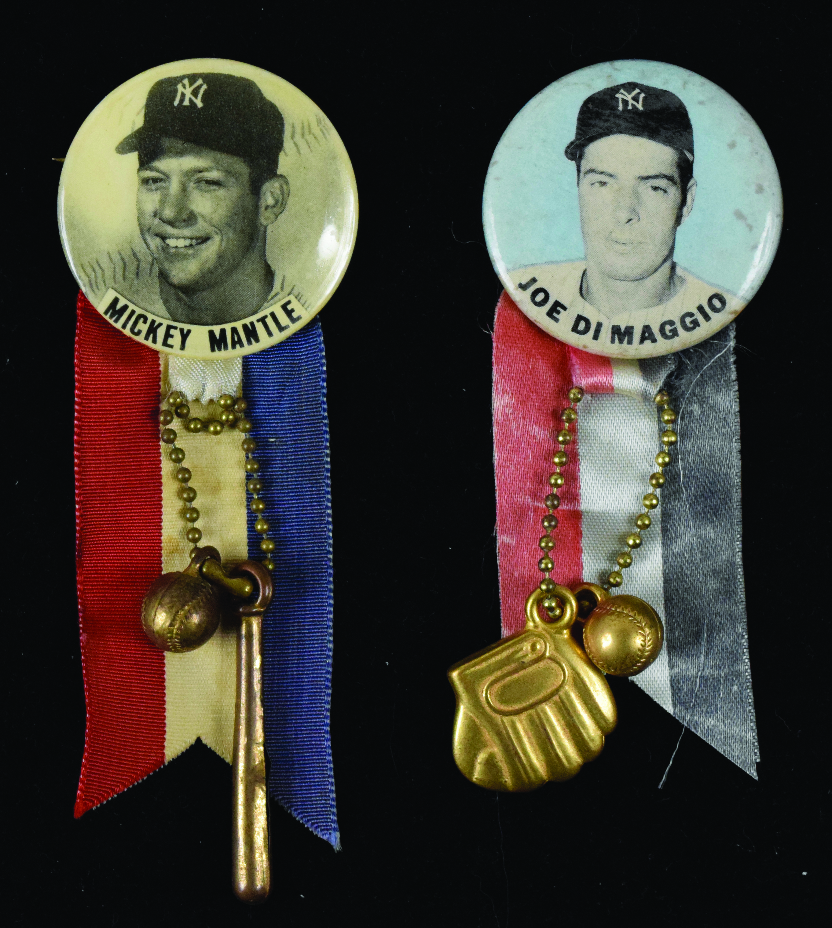 Description:Mickey Mantle and Joe DiMaggio PM10 Baseball Player pins, c.1950s (VG/EX-EX). Includes 1.75" Mickey Mantle baseball background variation pin with charms/ribbons still attached (EX), and 1.75" Joe DiMaggio light blue variation pin with charms/ribbons still attached (VG/EX).