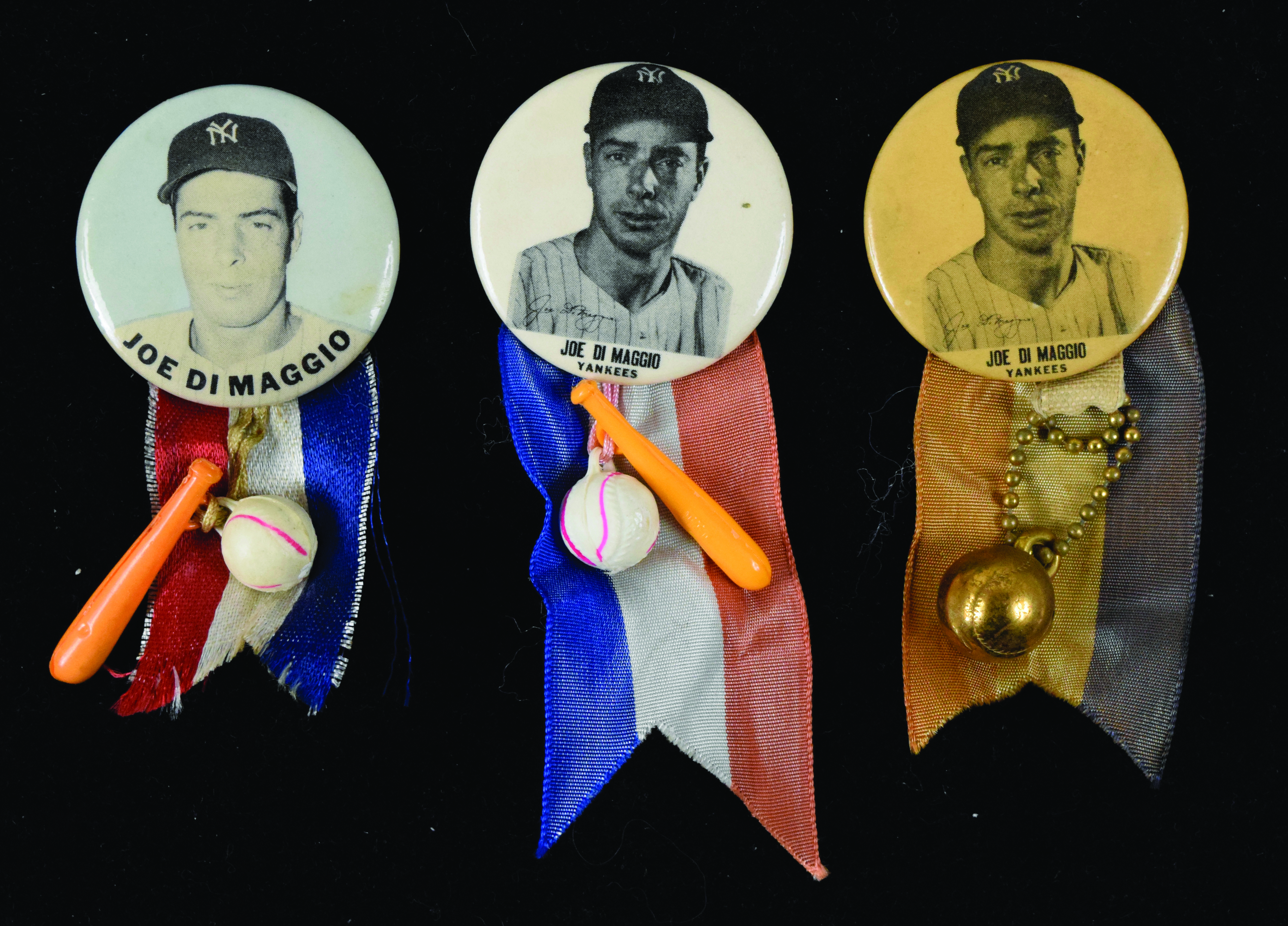 Description:Lot of (3) vintage Joe DiMaggio PM10 Baseball Player Pins, c.1950s (VG-EX). Includes 1.75" white background with name in strip variation and bat/ball charms and ribbons still attached (EX), 1.75" white background with name in strip variation and baseball charm and ribbon still attached (VG), 1.75" light blue variation with bat/ball charms and ribbons still attached (VG/EX).