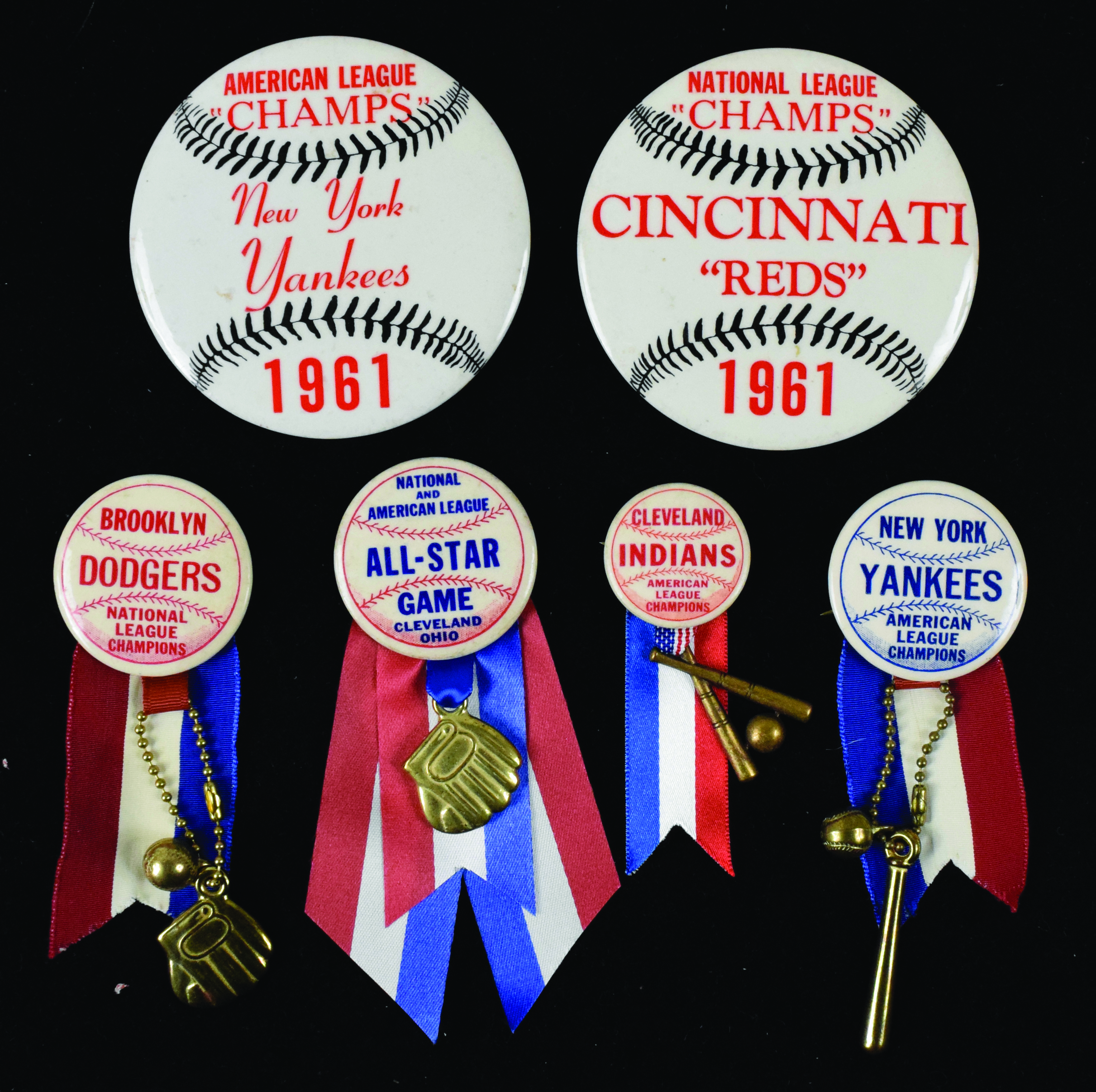 Description:Lot of (6) vintage All-Star Game & team championship pins, c.1950s-1961 (EX-EX/MT). Includes c.1950s 1.75" Brooklyn Dodgers NL Champions pin, c.1950s 1.75" New York Yankees AL Champions pin, 1.75" 1954 All-Star Game pin, 1.25" 1954 Cleveland Indians AL Champions pin, 3.5" 1961 Cincinnati Reds NL Champs pin, and 3.5" 1961 Yankees AL Champs pin: EX-EX/MT