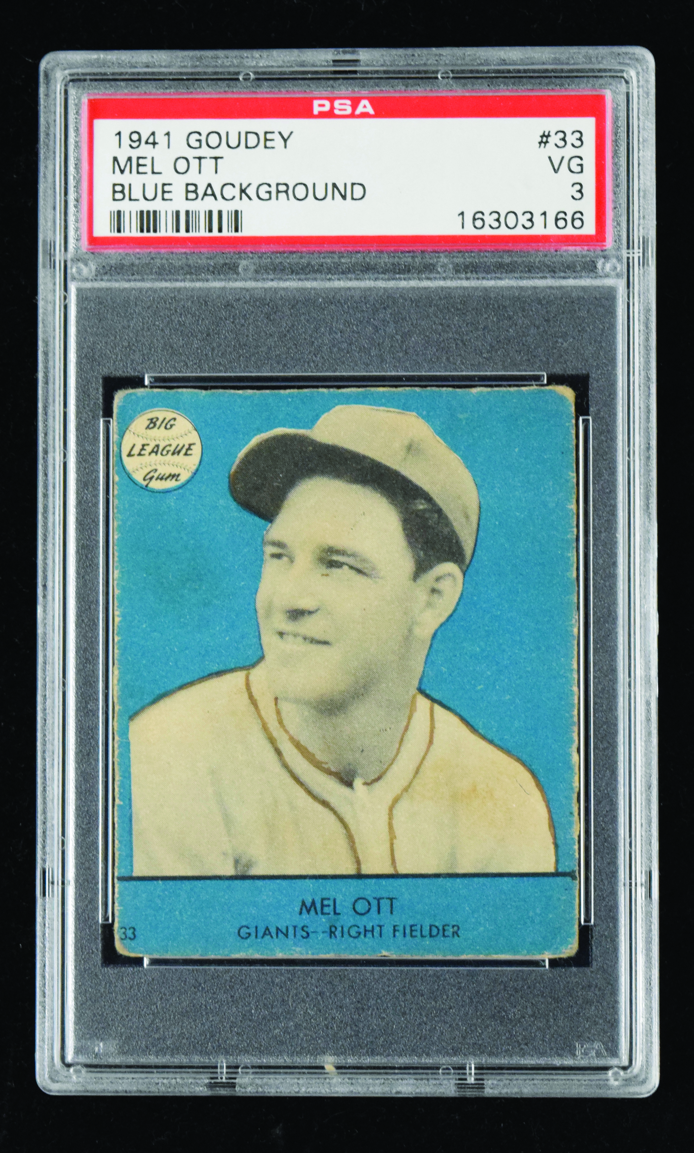Description:1941 Goudey #33 Mel Ott blue background (PSA 3 VG). Blue background variation card of the Hall of Famer Mel Ott exhibits four moderately rounded corners and light surface wear. Blank back is clean: PSA 3 VG. ($1,000-$1,500)