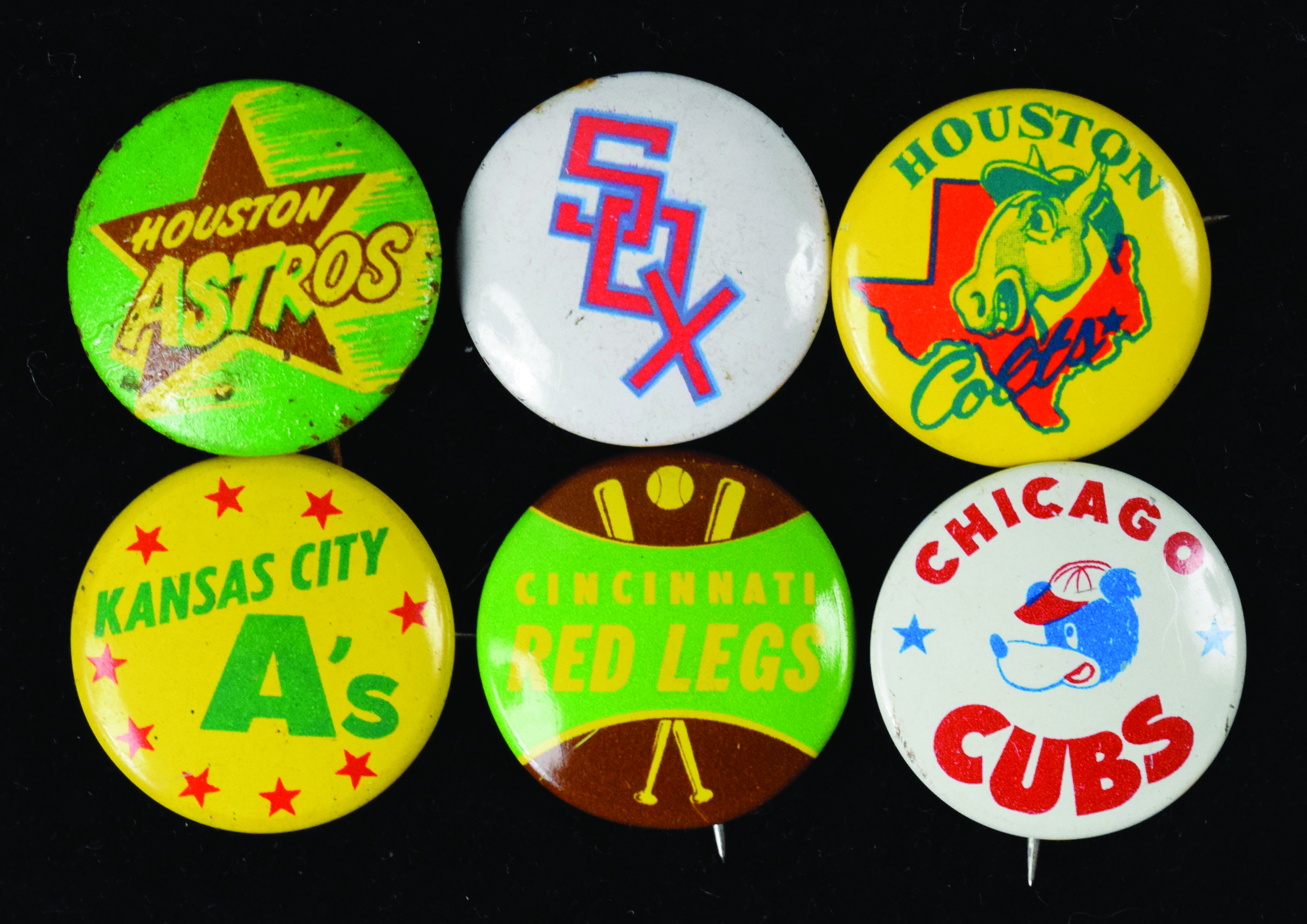 Description:Lot of (30) vintage MLB team pins, c.1960s - early 1970s (VG-NM/MT). Mostly 1" potato chip pins. Includes (3) Houston Colt 45s, Philadelphia Phillies, (2) Pittsburgh Pirates, (2) Houston Astros, (2) Cincinnati Red Legs, (2) Chicago White Sox, (2) Milwaukee Braves, (5) Kansas City A's, Chicago Cubs, New York Yankees, (4) Cleveland Indians, (2) Los Angeles Dodgers, (2) New York Mets, and Milwaukee Brewers. Most appear to average EX/MT overall. Range: VG-NM/MT