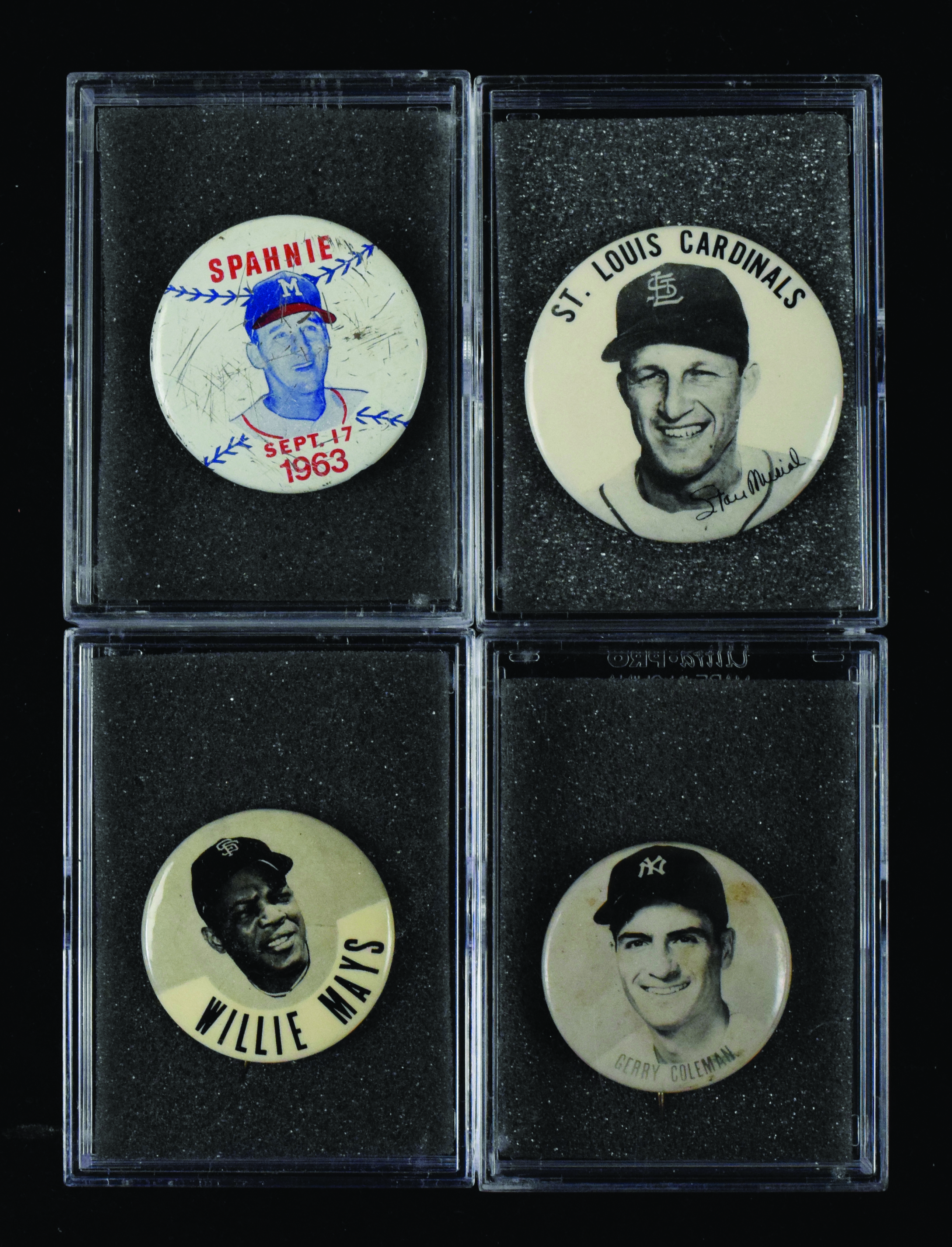 Description:Lot of (4) baseball stars and HOFers vintage pins, c.1950s-60s (GD-NM). Includes 2.25" Stan Musial pin (EX/MT), 2" 9/17/1963 Warren Spahn Day pin (GD), 1.75" Willie Mays pin (EX/MT-NM), and 1.75" Gerry Coleman pin (VG).
